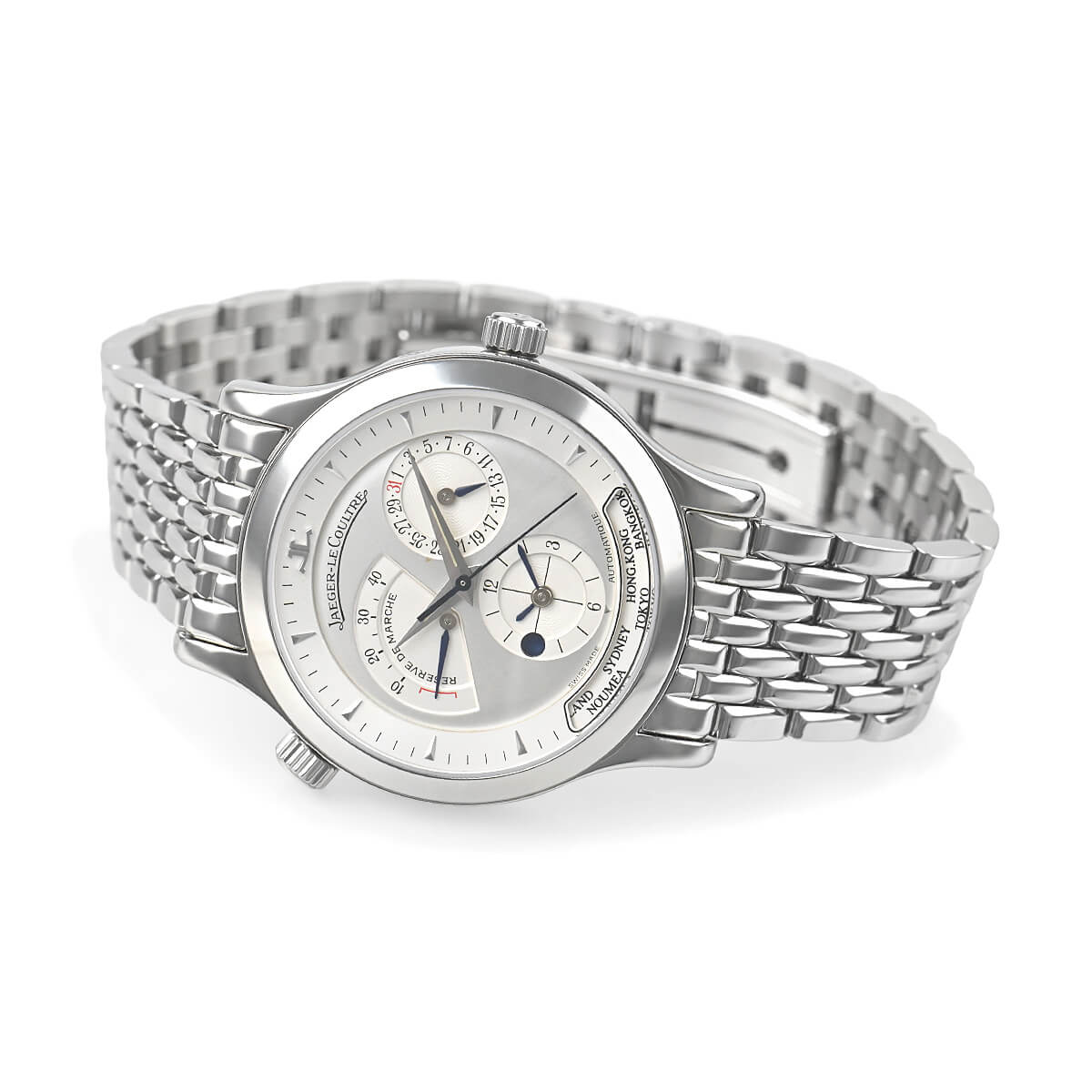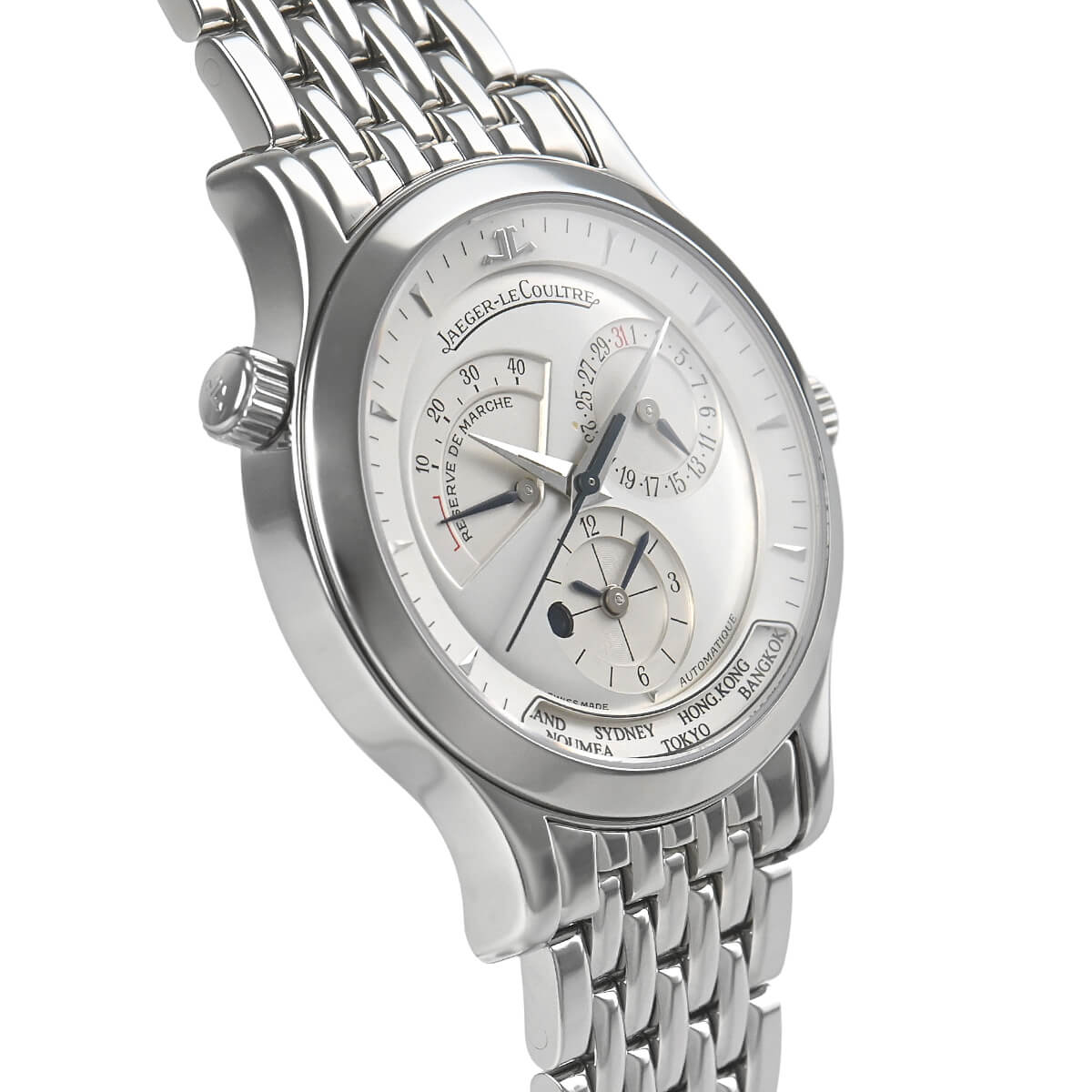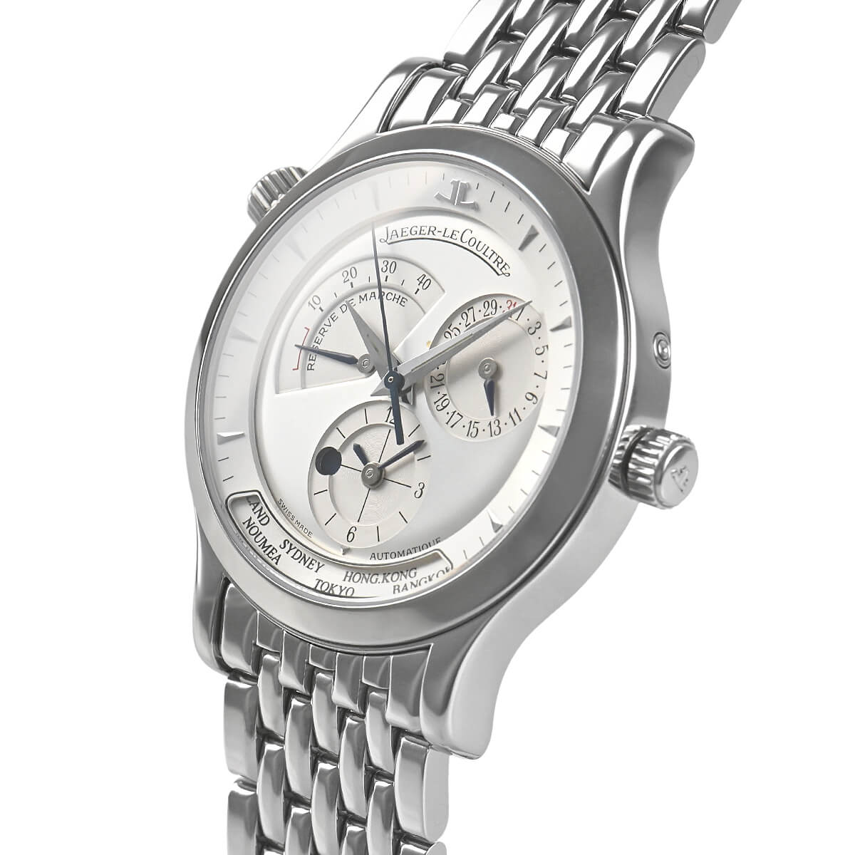 ジャガールクルトを代表するワールドタイムウォッチ「マスター・ジオグラフィーク」。10時位置のリューズを回転させることで、世界24のタイムゾーンを6時位置にある独立したインダイアルにて瞬時に確認できるモデルです。