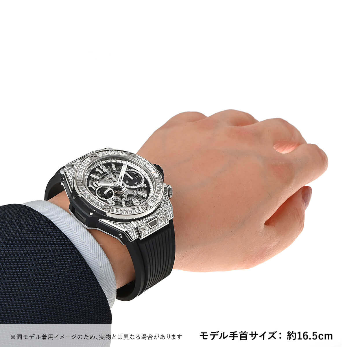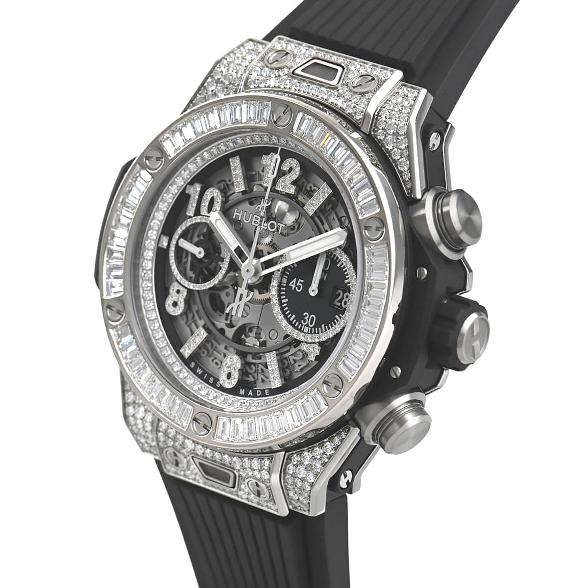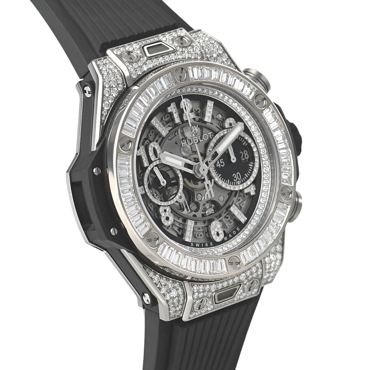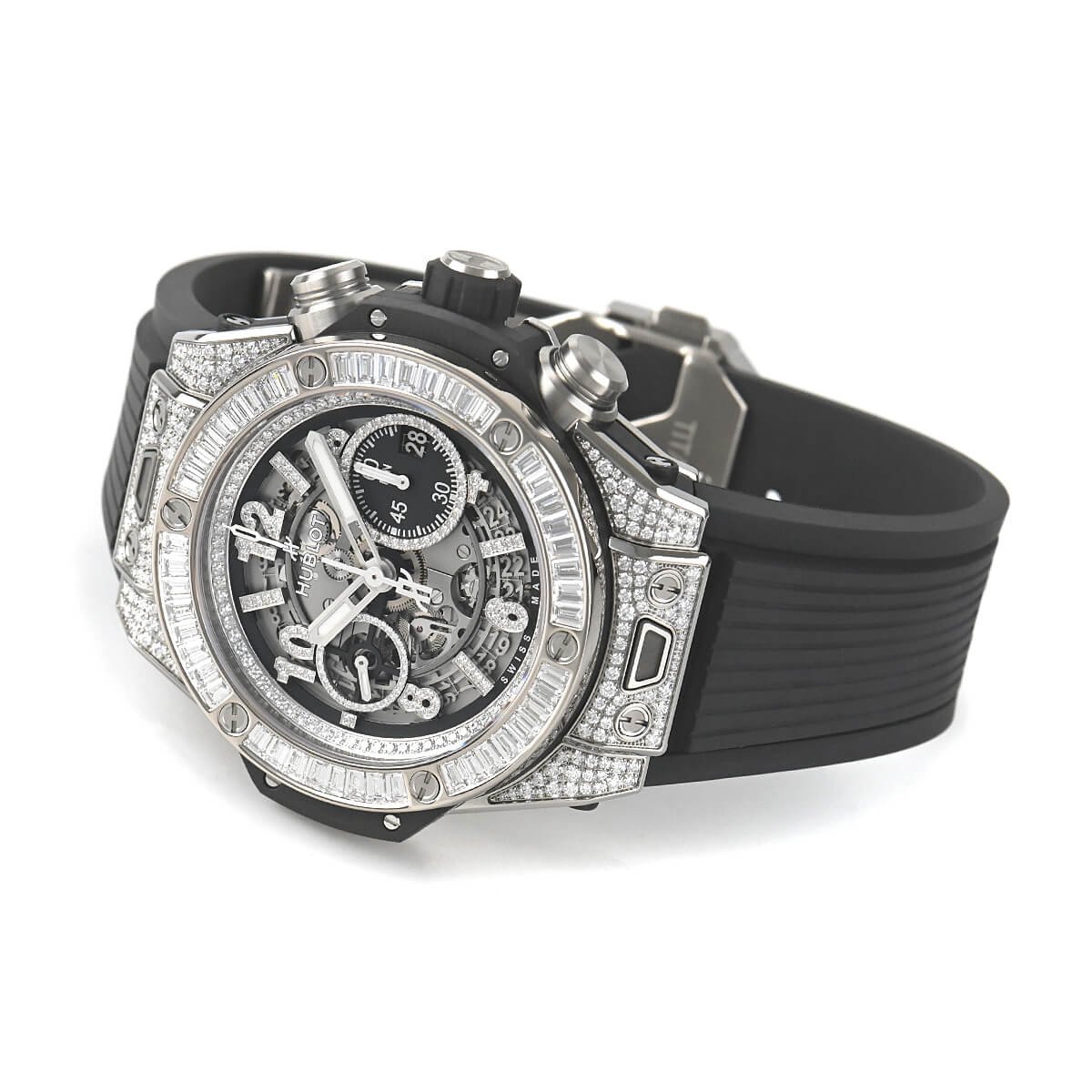 ウブロの誇る自社製フライバック・クロノグラフムーブメント“ウニコ”を搭載した【ビッグバン ウニコ】。こちらは44mmのチタンケースのベゼル部分にバケットダイヤ、ケースにはパヴェダイヤ、ダイアルのインデックス部分にもパヴェダイヤセッティングを施したスポーティーでゴージャスな一本。