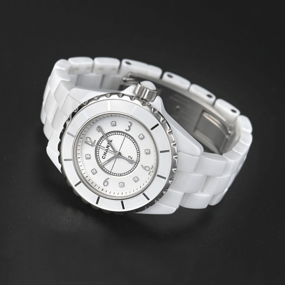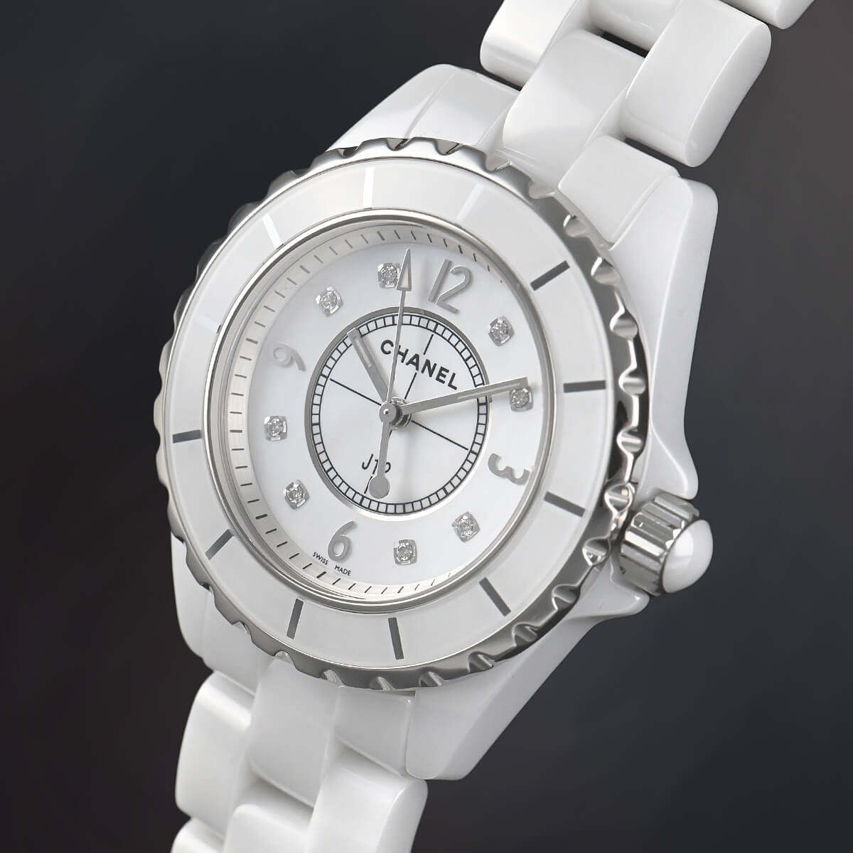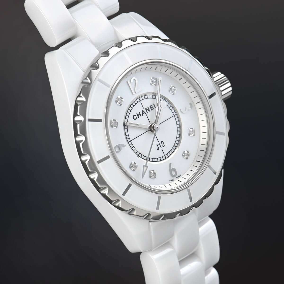 シャネルのアイコンウォッチ【J12】。こちらは33mmとなり、ホワイトシェルに8ポイントのダイヤセッティングを施したモデル。