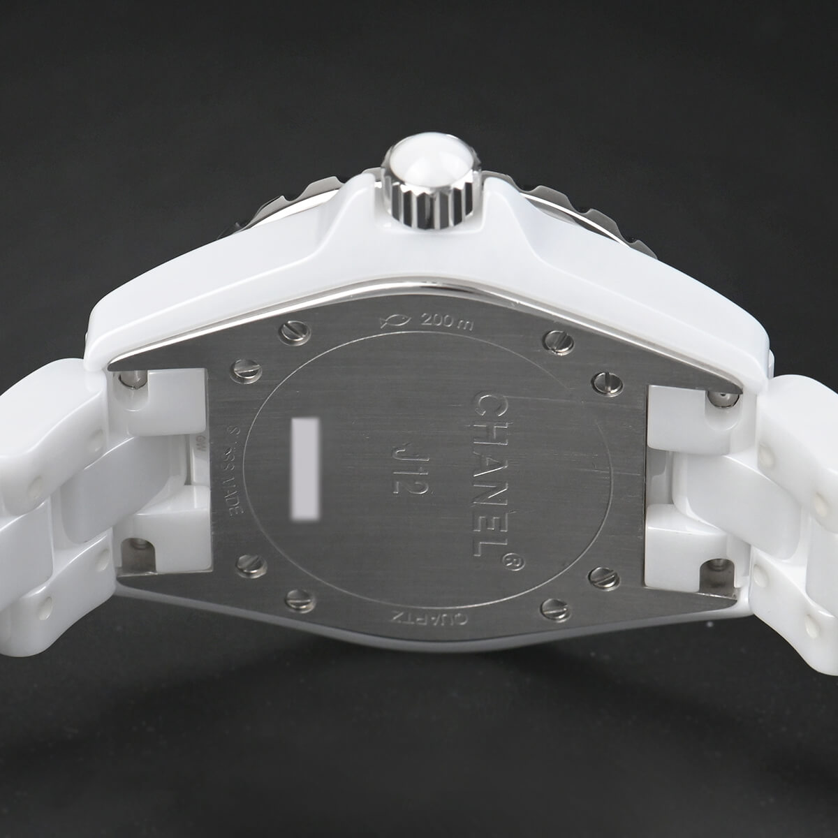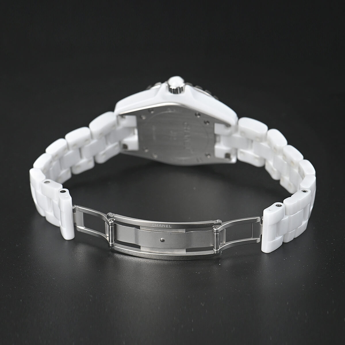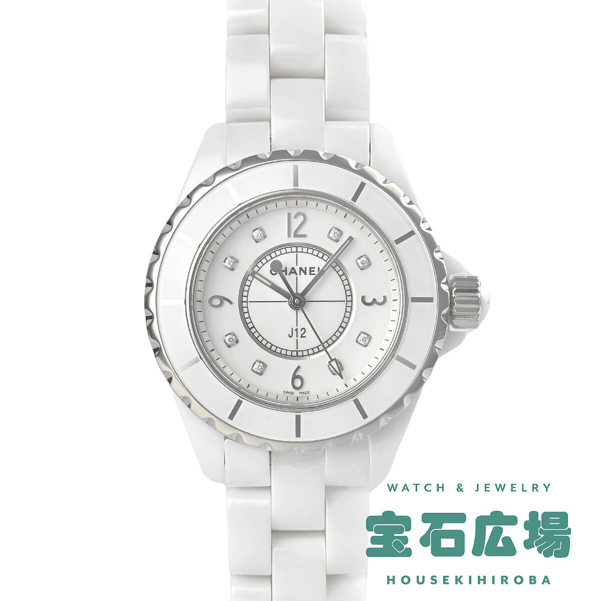 シャネルのアイコンウォッチ【J12】。こちらは33mmとなり、ホワイトシェルに8ポイントのダイヤセッティングを施したモデル。
