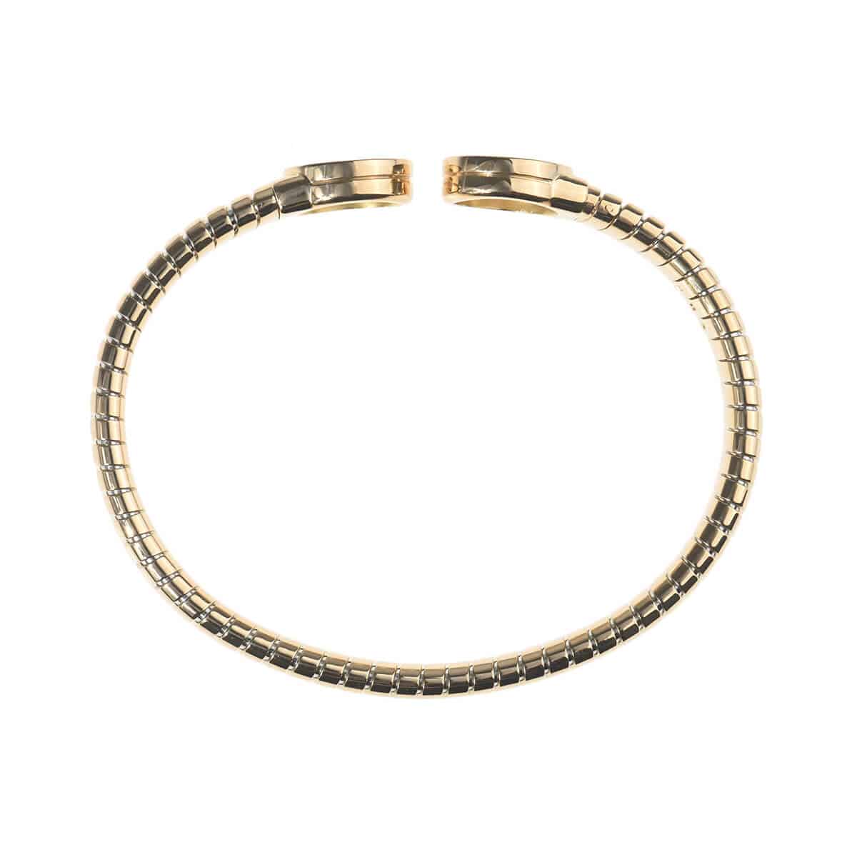 シンプルながら『BVLGARI(ブルガリ)』らしさも感じられる定番「ブルガリブルガリ」コレクション。ブランドアイコンともいえるダブルロゴは、古代のコインに施された曲線的な文字からインスピレーションを得て誕生しました。伊語で“ガスチューブ”の意味を持つ「トゥボガス」のオープンバングル両端に、オニキスがセッティングされたブルガリブルガリのダブルロゴモチーフがあしらわれたイエローゴールド製バングルです。数十年にも及ぶブルガリの宝飾技術により生み出された特殊なスプリングを使用する事により、よりフレキシブルなつけ心地を実現したバングルはユニセックスに。ボリュームと洗練を兼ね備え、精巧な技術とイタリアらしいデザインが融合されたブルガリらしいコレクションジュエリーです。