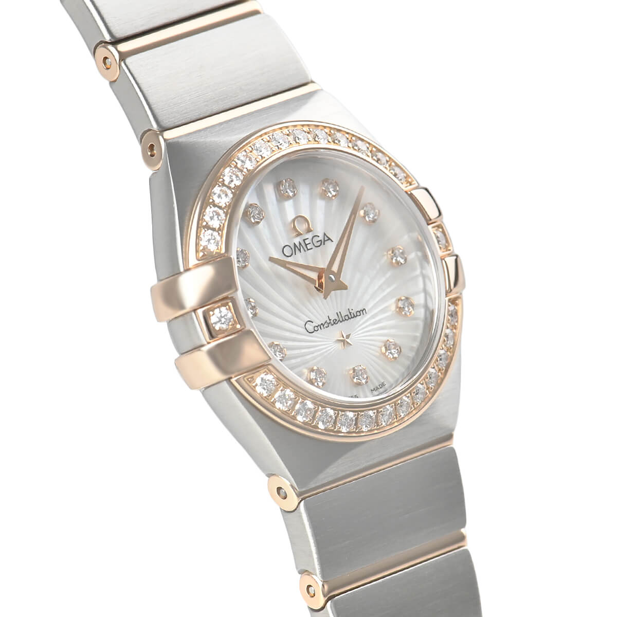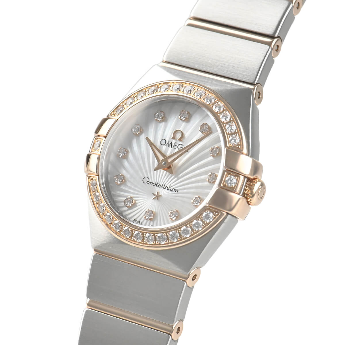 スーパーノヴァ模様が彫られたホワイト・マザーオブパールダイアルとベゼル部分にはダイヤモンドがセッティングされており、清楚で華やかな印象です。