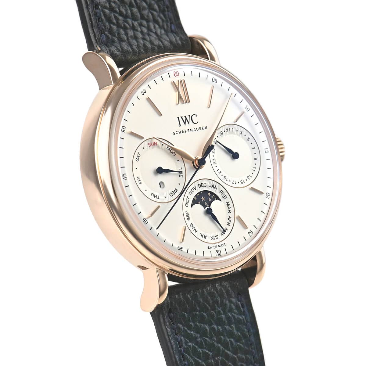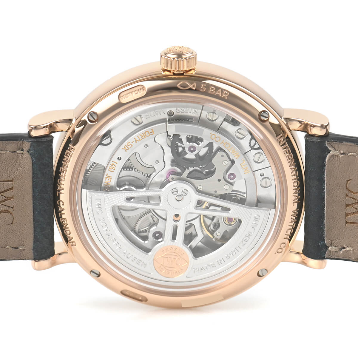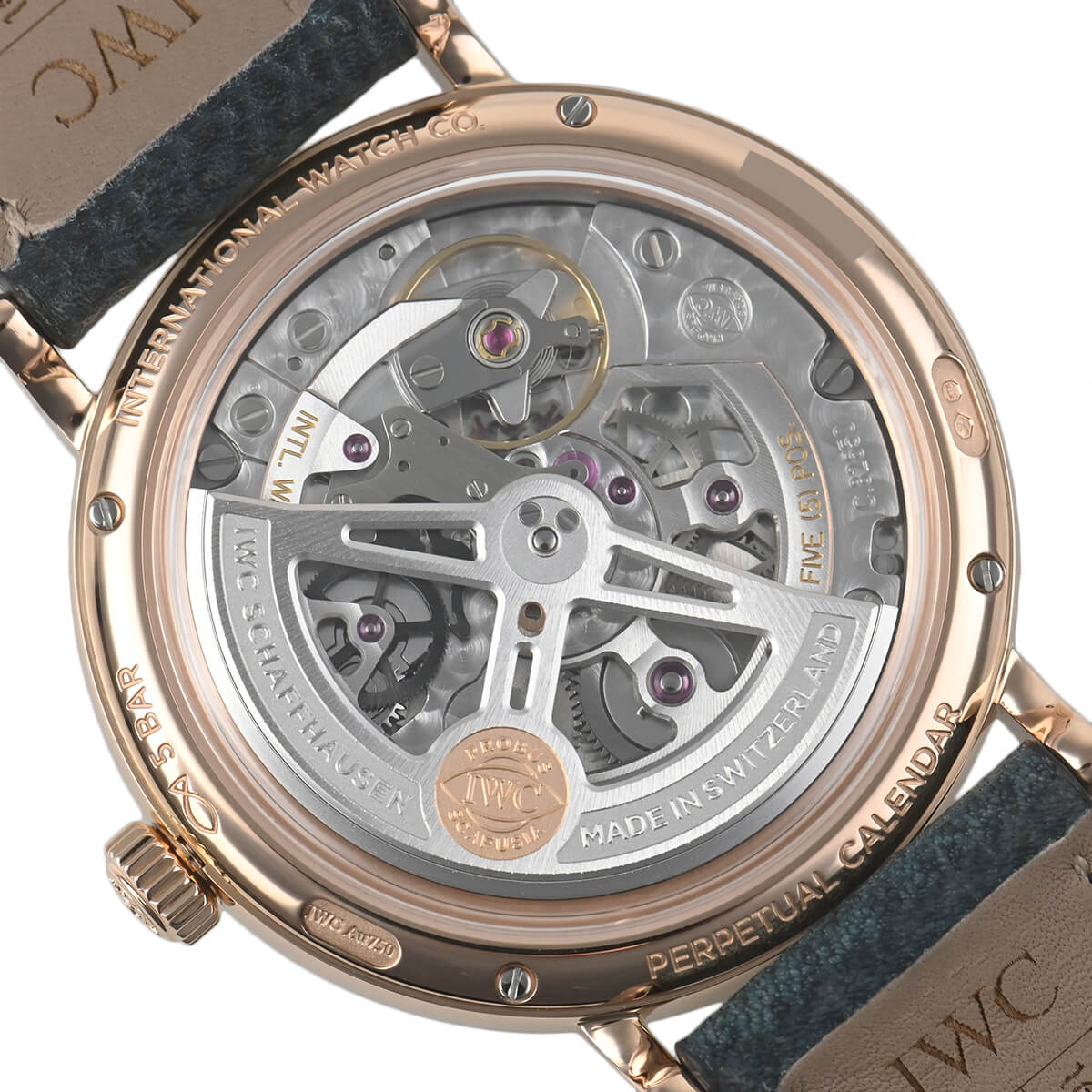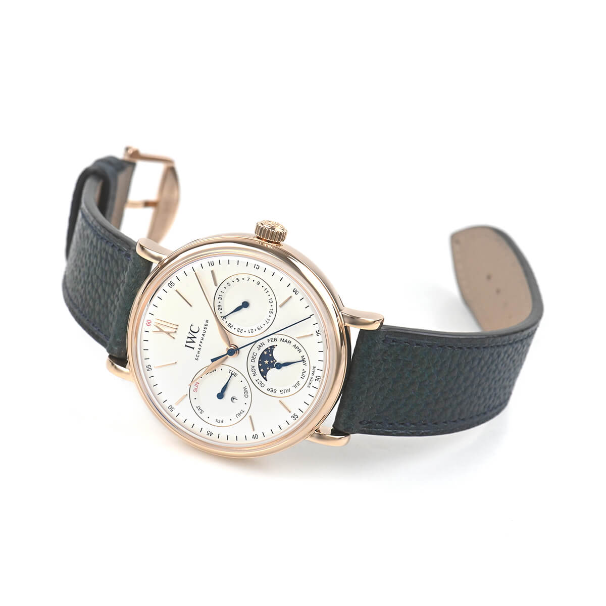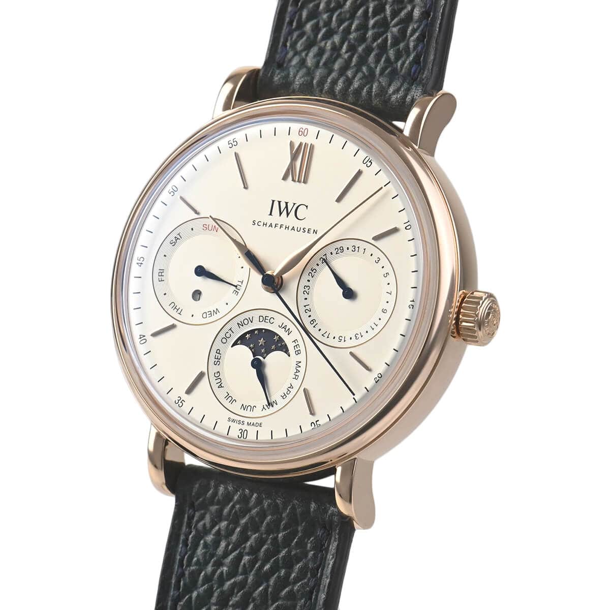 レッドゴールドの品有る色合いが美しい「ポートフィノ パーペチュアルカレンダー」。IWC自社製キャリバー82650を搭載し、最大60時間のパワーリザーブを蓄えます。