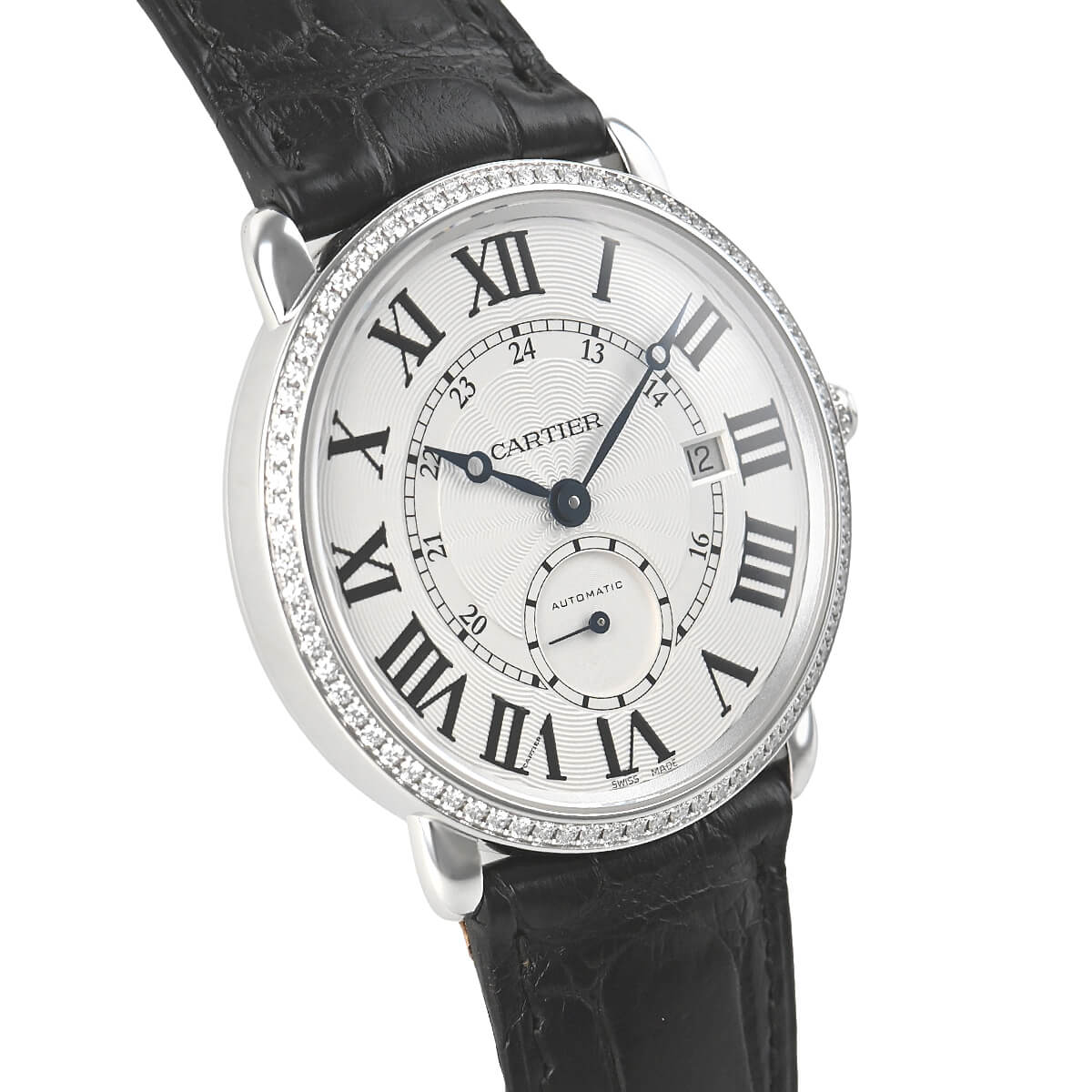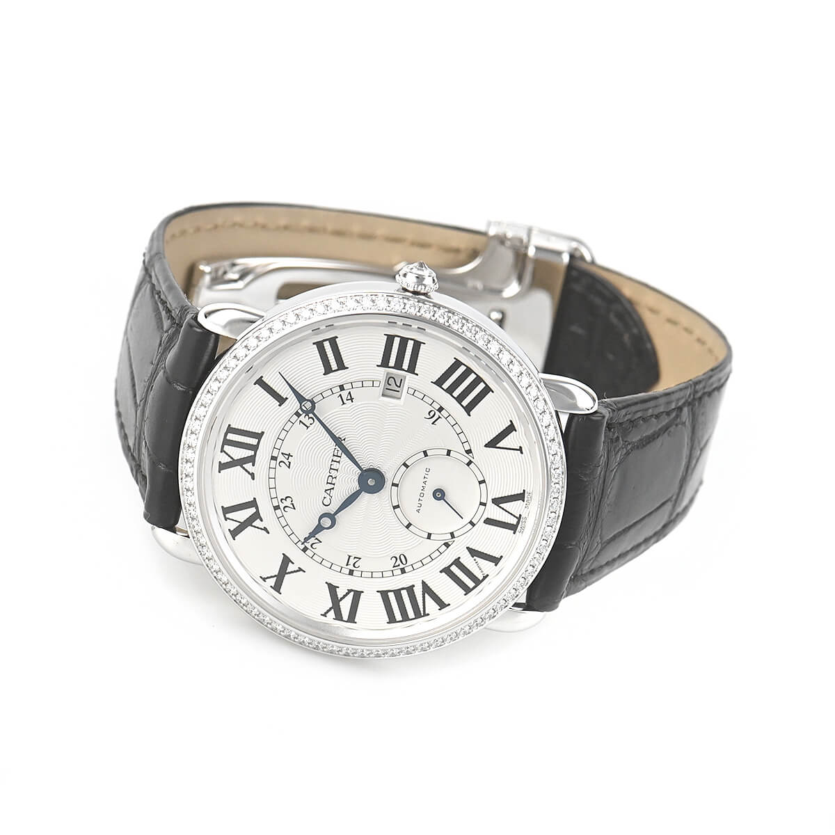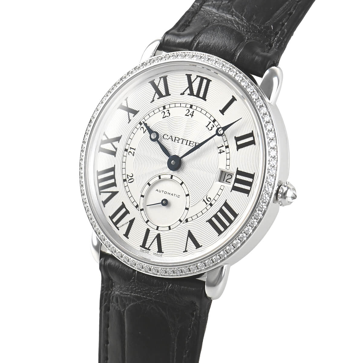 ローマインデックス、レイルウェイ分目盛り、ブルースチール製アップルハンドなど、カルティエらしいクラシカルなスタイルの「ロンド ルイ カルティエ」。こちらは40mmと大ぶりな時計で、ダイヤモンドで取り巻かれているにもかかわらず、上品な雰囲気が漂う一本です。