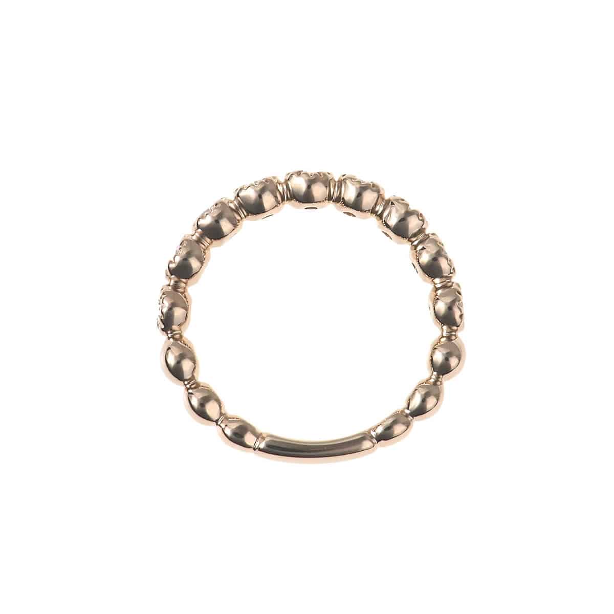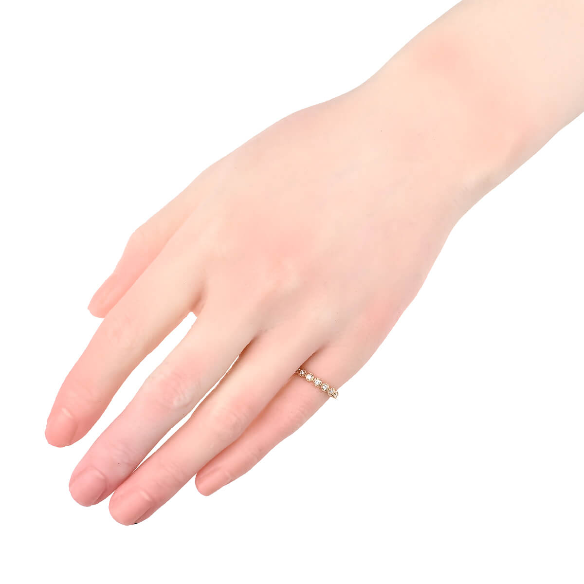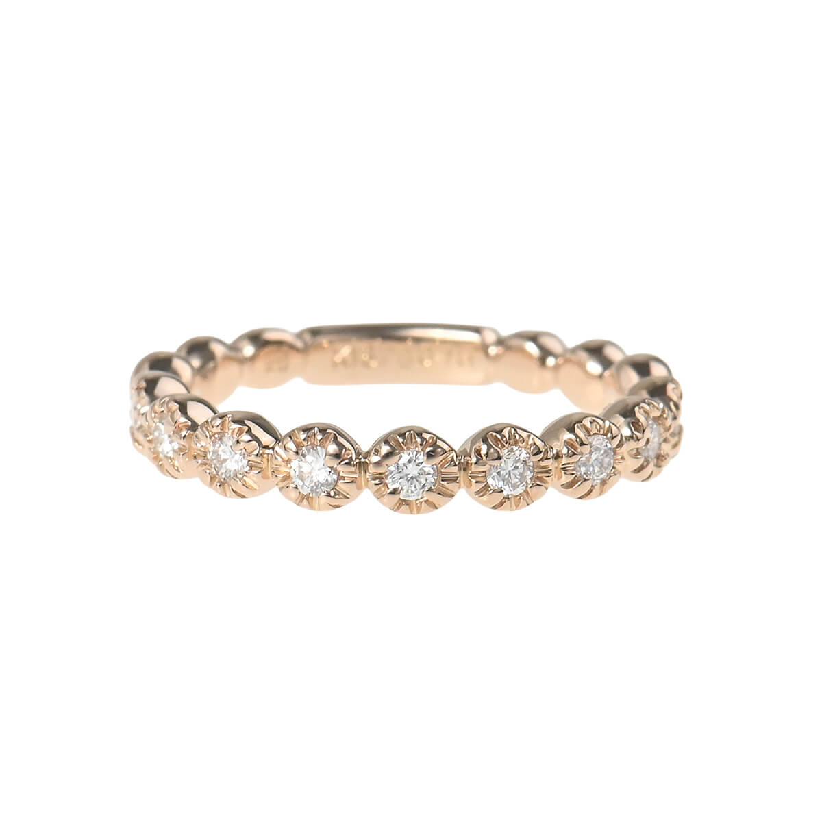 イタリア、フィレンツェ最古の橋であり、建造以来橋上に金細工師の商店が並んでいた、アルノ川にかかる石造アーチの橋“ポンテヴェキオ橋”。その名を冠したドメスティックジュエリーブランド『PonteVecchio(ポンテヴェキオ)』は、1981年の創業以来“Romantic Luxury(ロマンティック ラグジュアリー)”をキーワードに、ジュエリーが紡ぎだすロマンティックな物語、こだわりのマテリアルと熟練の職人技術によって表現されるラグジュアリーな価値を、遊び心あふれるファインジュエリーに昇華し続けています。ミルグレインの枠にセットされたダイヤモンドが連なる、ピンクゴールド製リング。アンティークレースのようなやさしげなデザインのリングが、軽やかに、繊細にきらめいて指先を飾ります。さりげない仕草にまで本物の輝きを添えてくれる、愛らしく上質なダイヤモンドジュエリーです。
