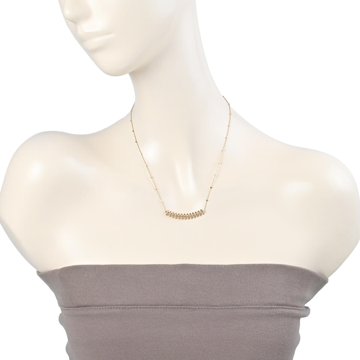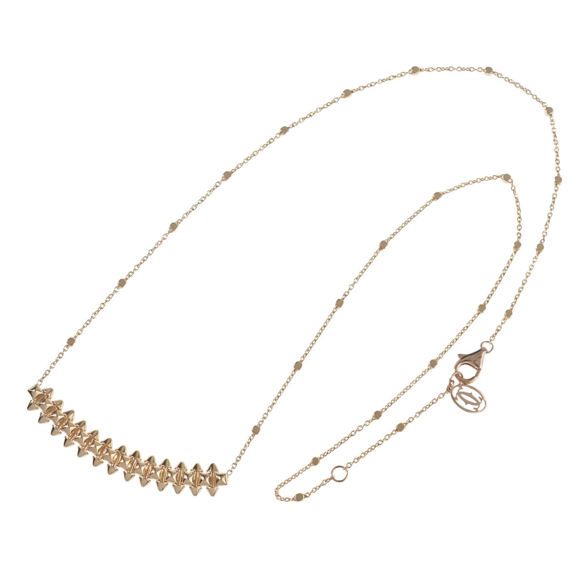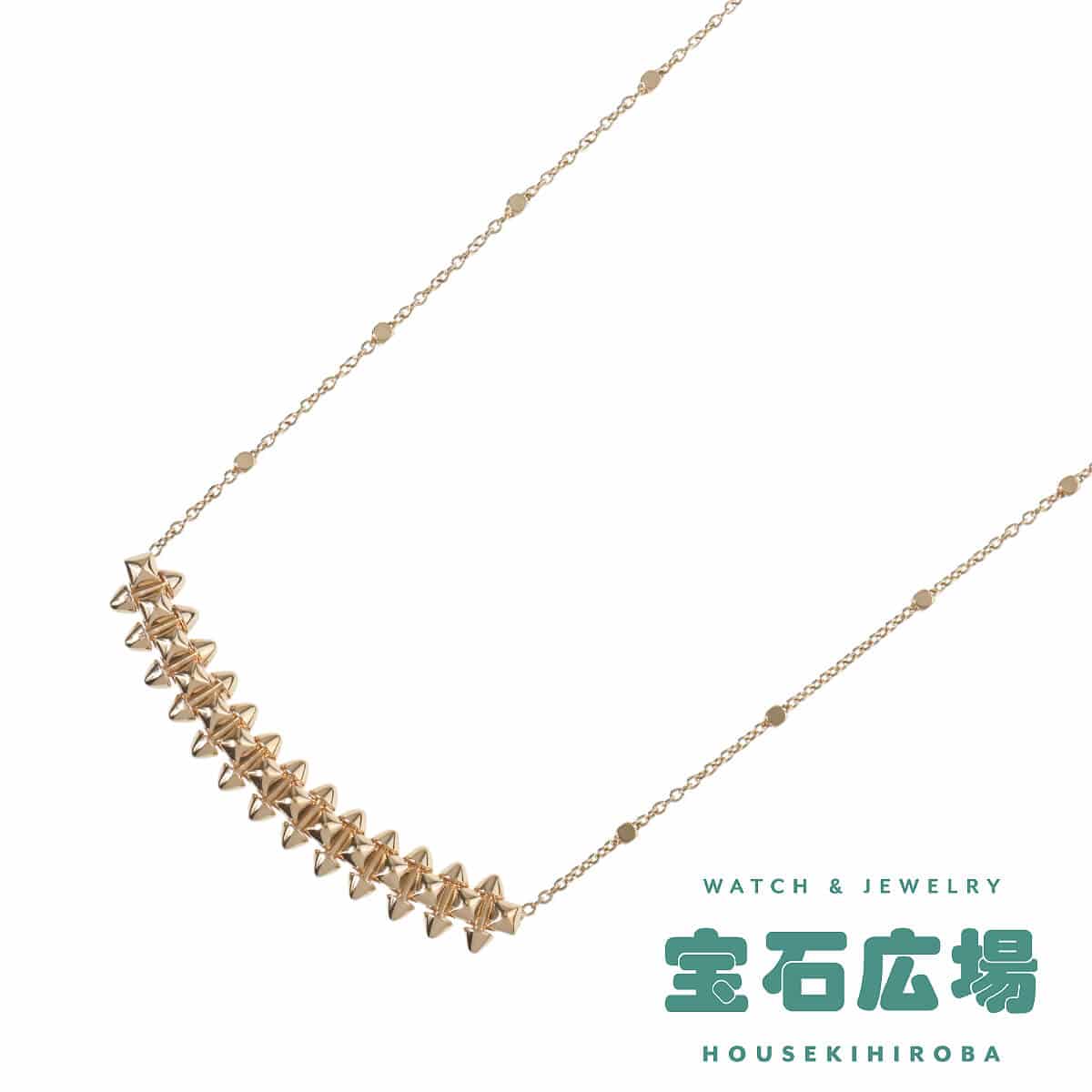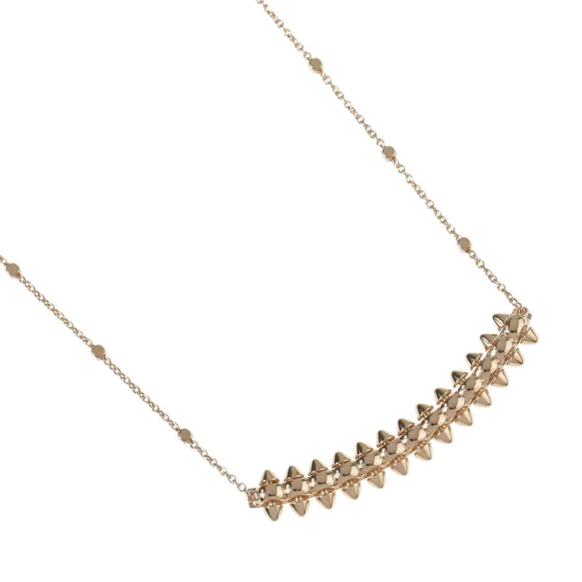 クラシックなフォルムとそこからの解放、削ぎ落されたラインと有り余るエネルギー、真面目さとちょっと羽目を外す感覚、そんな相反するものを同時に主張する「クラッシュ ドゥ カルティエ」コレクション。ジオメトリック、スタッズ、クル カレ、そしてクリエイティブな遊び心、そんな『Cartier(カルティエ)』の象徴的で伝統的なデザインコードをモダンに解釈し独創的に組み合わせた、斬新でシックなこのコレクションは未来に引き継がれるアイコンです。フランス語で“スクエア(正方形)”を意味する「カレ」から生まれたカルティエの象徴的なコードのひとつ「クル カレ」がライン中央に並び、その両サイドにあしらわれた「ピコ」と呼ばれる円錐状のスタッズと幾何学的なデザインコントラストを描く、ピンクゴールド製ネックレス。ジオメトリックでありながらどこかフェミニン、ミニマルなデザインでありながら複雑な構造を持つ、相反するふたつの魅力を同時に主張するそのフォルムが美しく、カルティエらしい洗練を纏ったネックレスです。