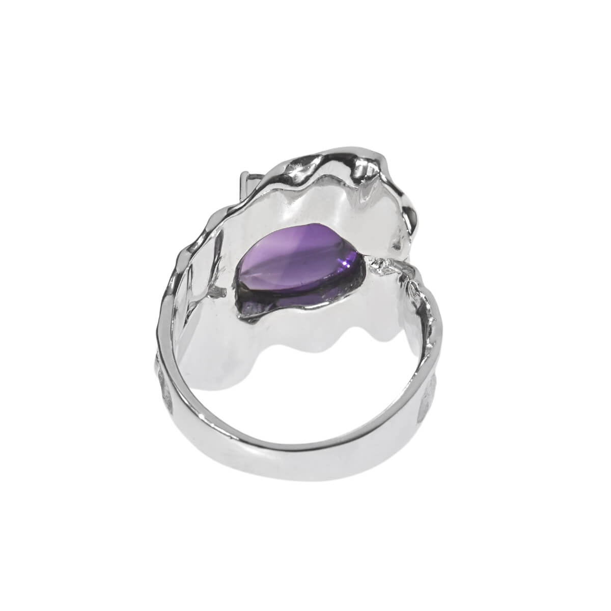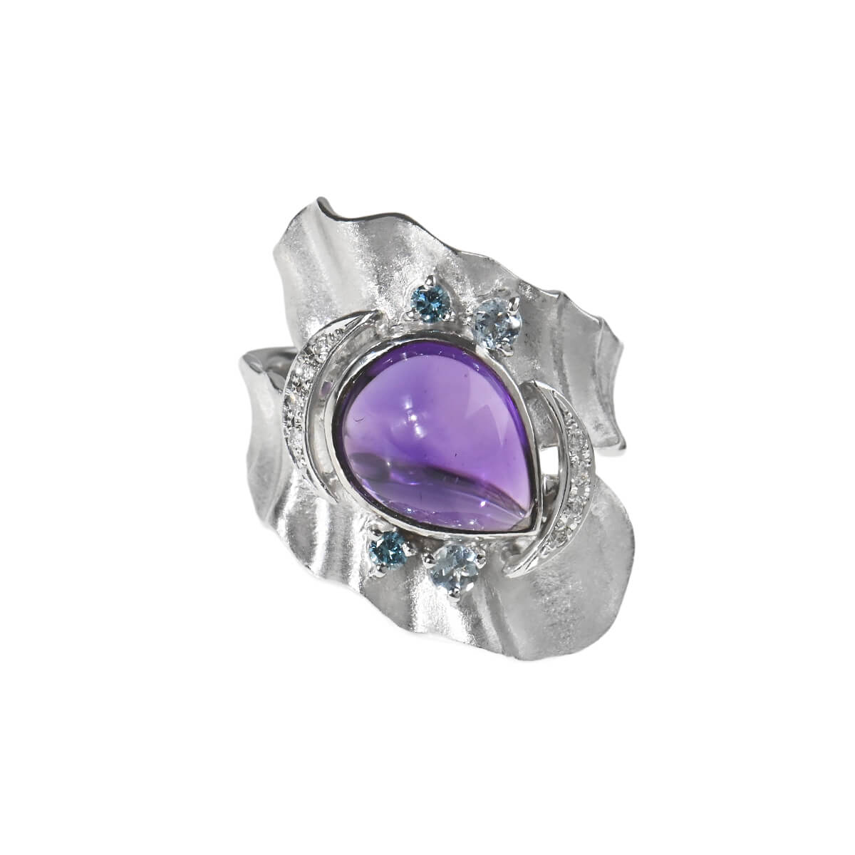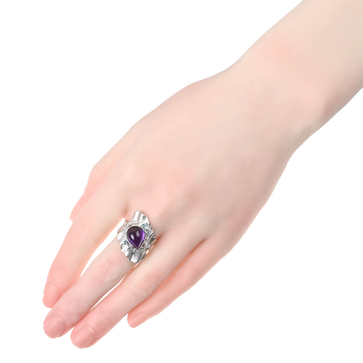 3.65ctの大粒なカボションアメシストが、まるで風を纏うかのようにきらめくダイヤモンドとブルートパーズに包み込まれたホワイトゴールド製リング。妖艶な魅力を放つ、深く瑞々しい紫色が指先を色彩豊かに印象づけます。まるで芸術作品のような細やかで美しい細工と大胆なデザイン性をもちながら、指通りの良さとぴったりと寄り添う着け心地の良さも魅力。天然石ならではの神秘的なたたずまいを最大限に生かした大胆な美しさにあふれるカラーストーンジュエリーは、身につけた時の存在感も抜群ですね。