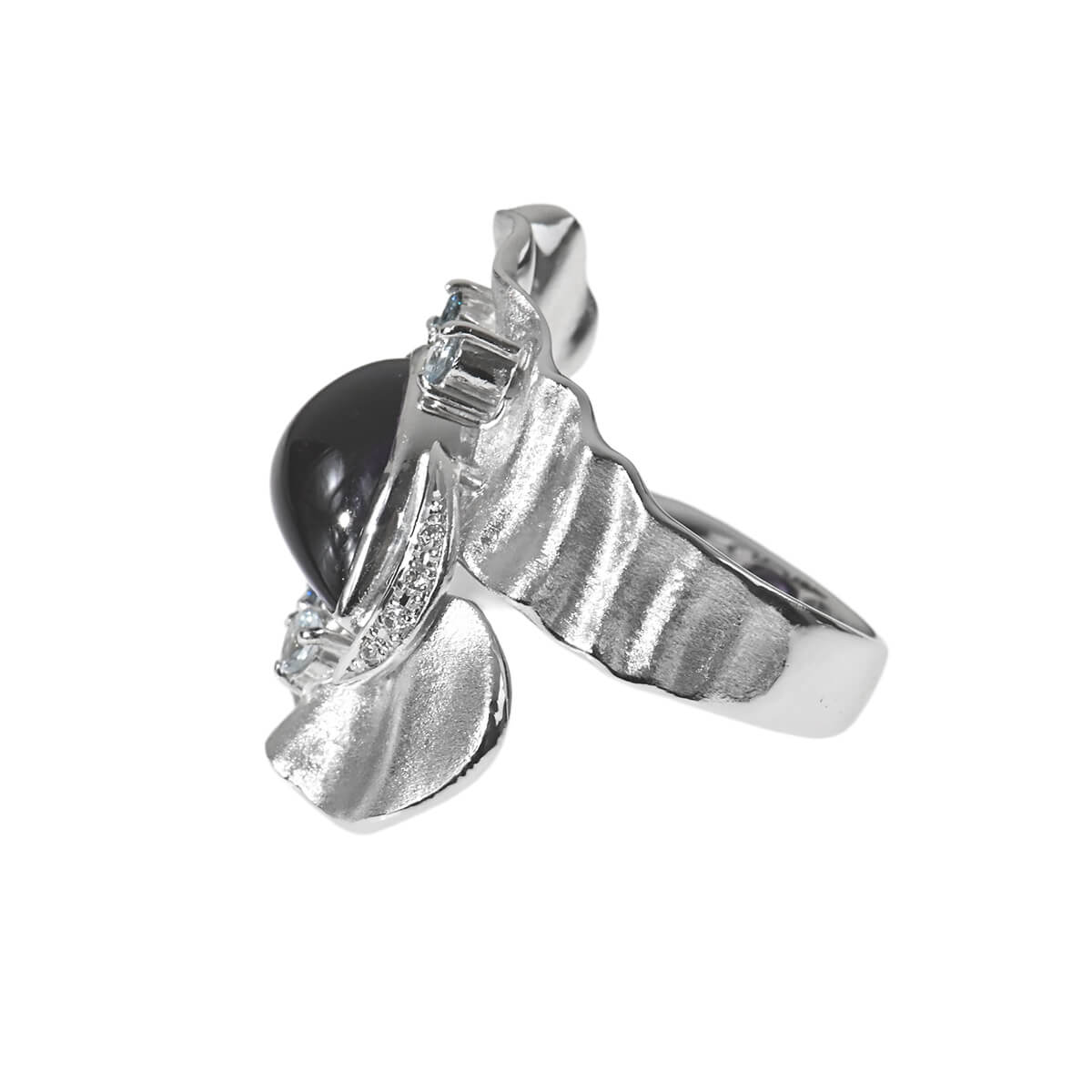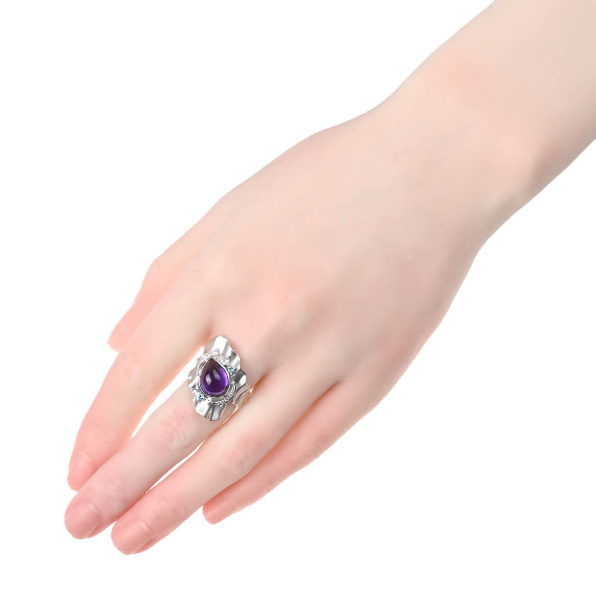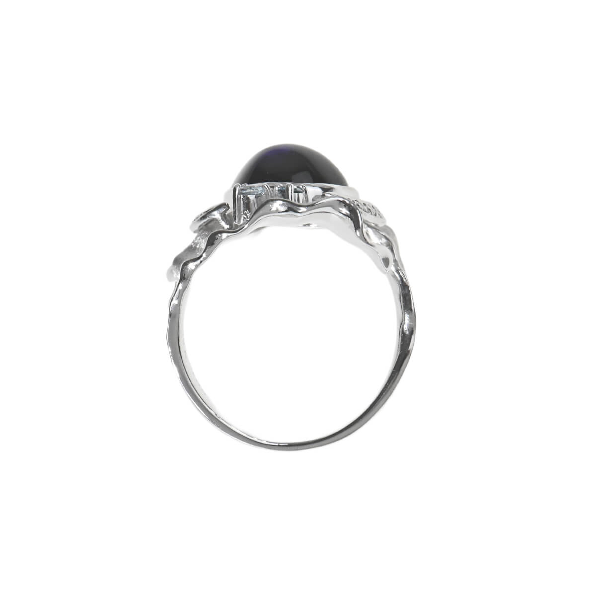 3.65ctの大粒なカボションアメシストが、まるで風を纏うかのようにきらめくダイヤモンドとブルートパーズに包み込まれたホワイトゴールド製リング。妖艶な魅力を放つ、深く瑞々しい紫色が指先を色彩豊かに印象づけます。まるで芸術作品のような細やかで美しい細工と大胆なデザイン性をもちながら、指通りの良さとぴったりと寄り添う着け心地の良さも魅力。天然石ならではの神秘的なたたずまいを最大限に生かした大胆な美しさにあふれるカラーストーンジュエリーは、身につけた時の存在感も抜群ですね。