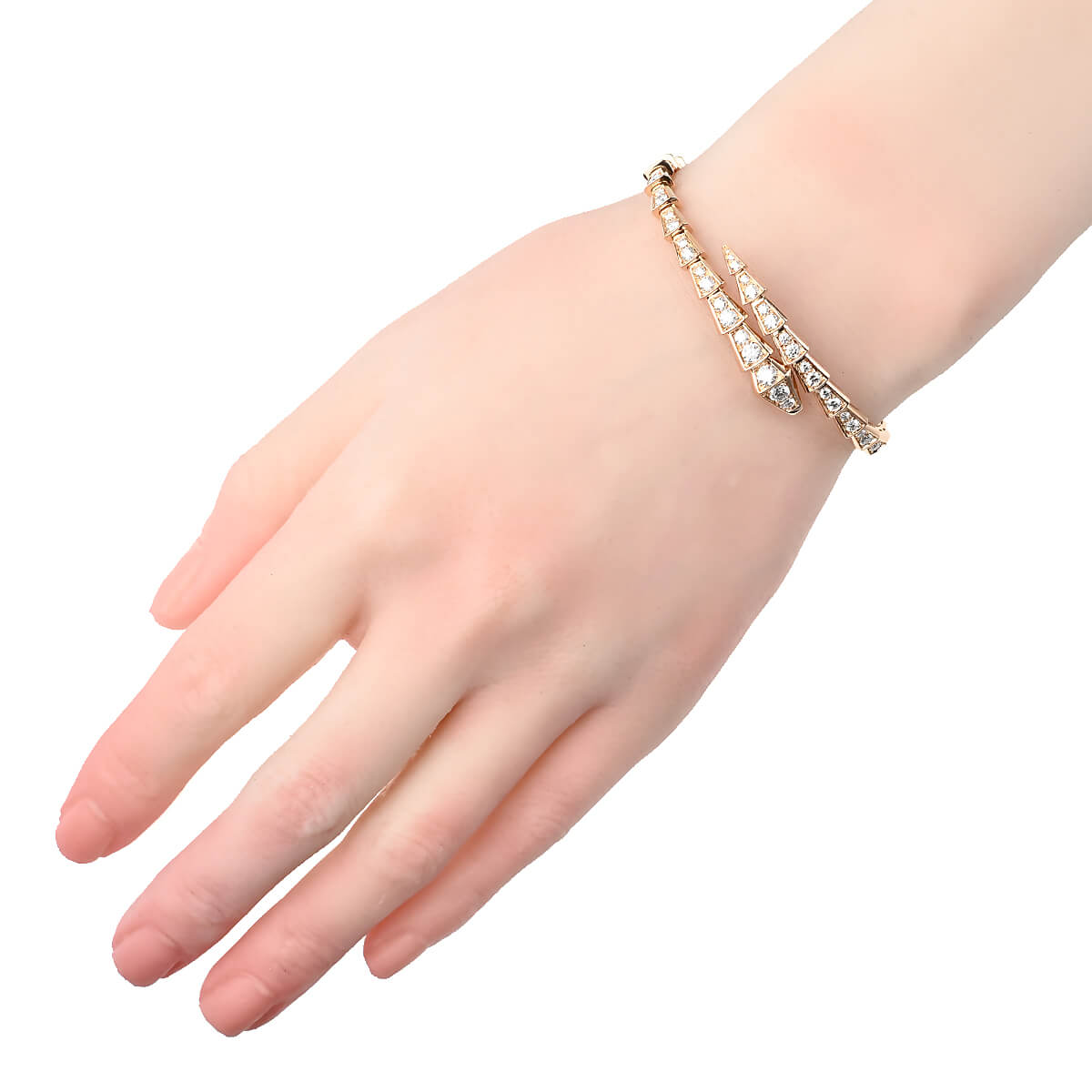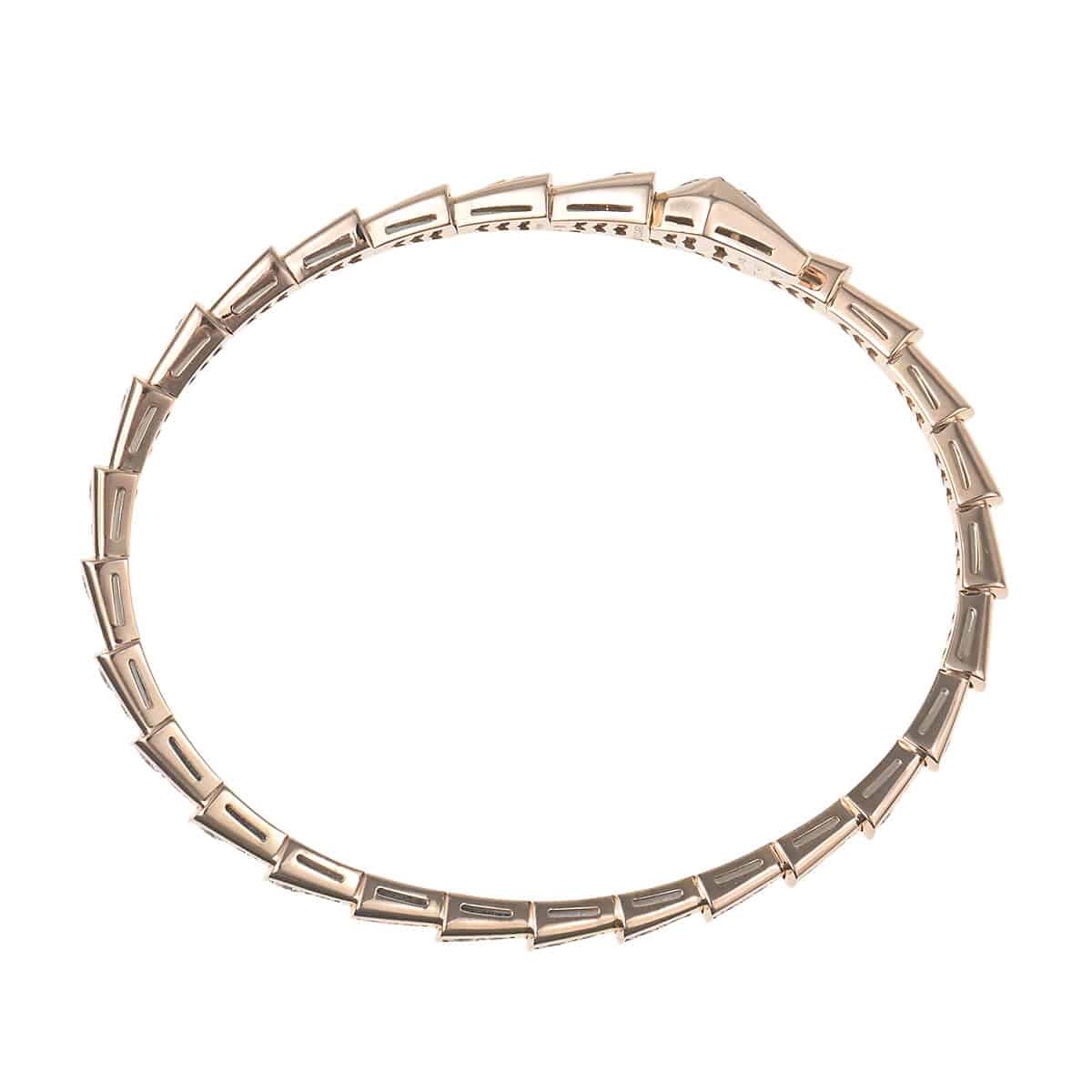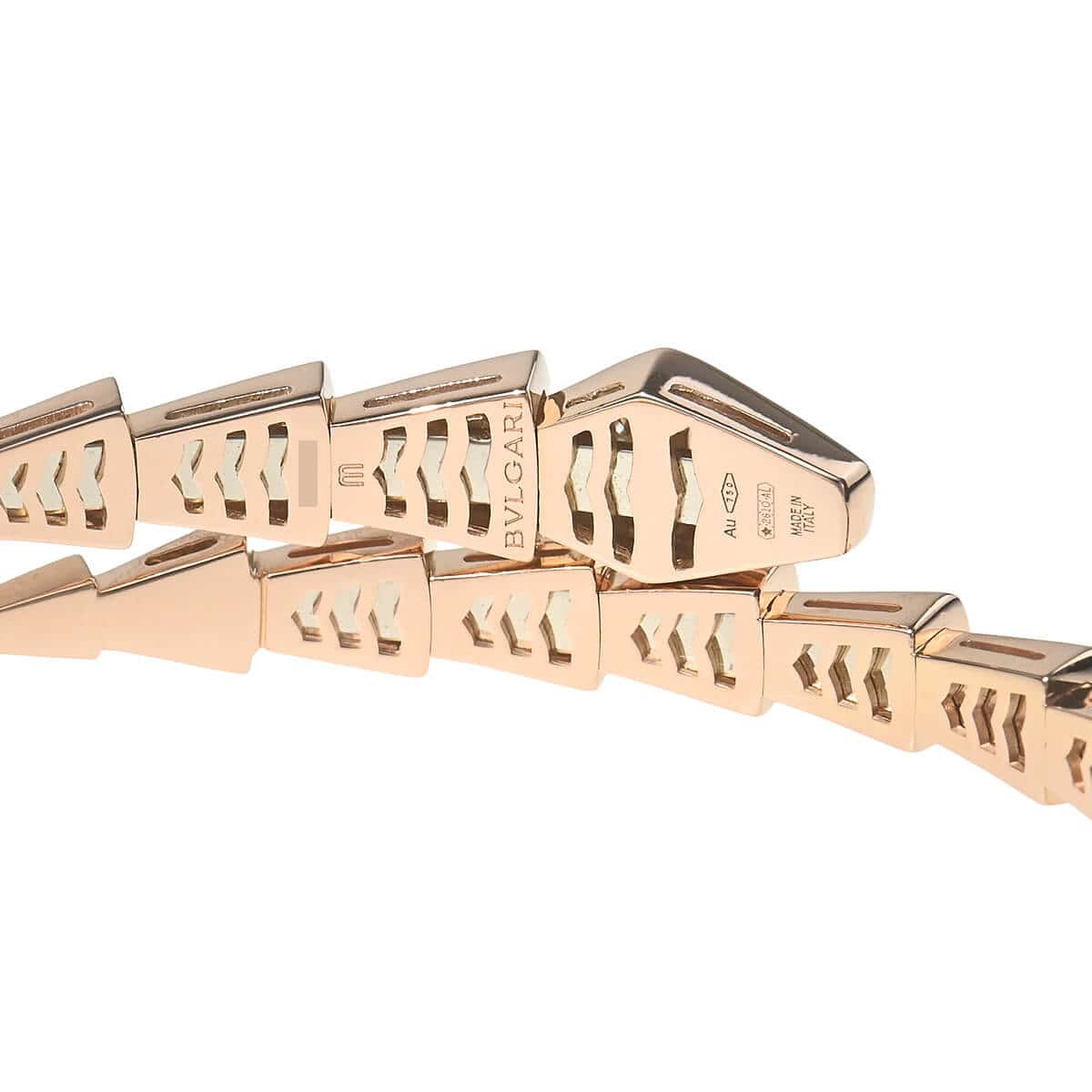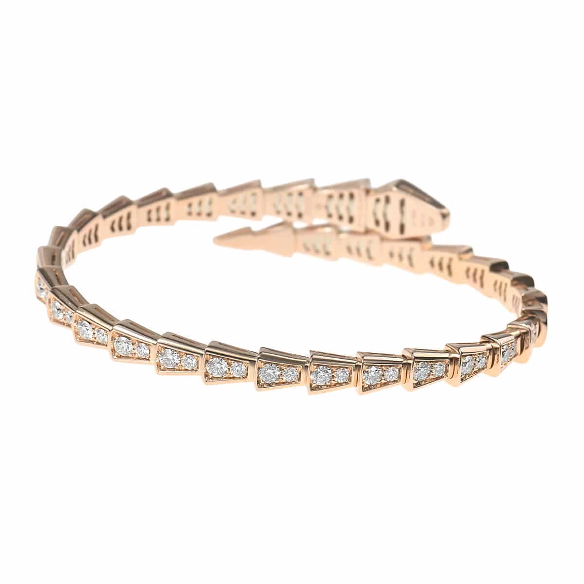 へビの魅惑的な力にインスピレーションを得た『BVLGARI(ブルガリ)』「SERPENTI(セルペンティ)」は、イタリアが誇る至高のクラフツマンシップと禁じられたものに手を伸ばすメゾンの大胆な姿勢が融合した、大胆でありながら洗練されて上品、官能的で魅惑的なコレクション。美しさと洗練さを兼ね備え、精巧な技術とイタリアらしいデザインが融合された、「SERPENTI(セルペンティ)」ピンクゴールド製ブレスレットです。うろこの危険な美しさとヘビのくねりが溶け合った、官能と誘惑を仕掛ける妖艶なデザインがセンシュアルに手首に巻き付き、包み込むような曲線で魅了します。このうえなく美しいダイヤモンドの煌めきをまとった、攻撃を仕掛ける前のヴァイパーのスパイラルな動きを思わせるデザインが、ひときわ目を引く存在感を放つブレスレットです。