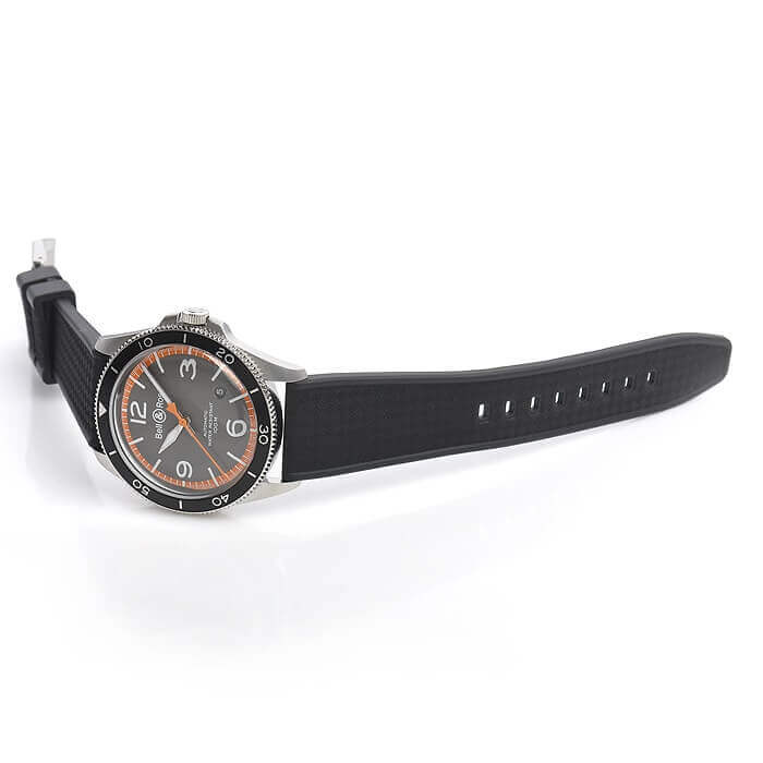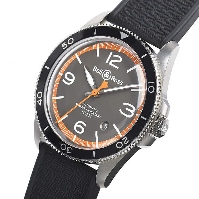 「BRV2−92 ガードコート」は、ボックス型のサファイアクリスタルガラスにマットグレー文字盤を合わせ、秒針とミニッツスケールにオレンジを使うことでカジュアルでありながらも視認性に優れたパイロットウォッチです。