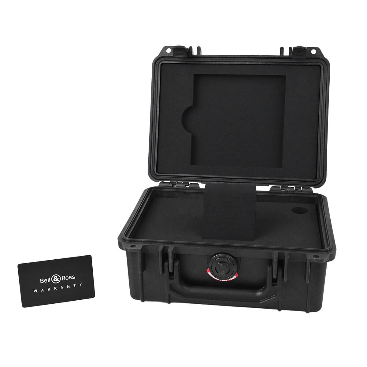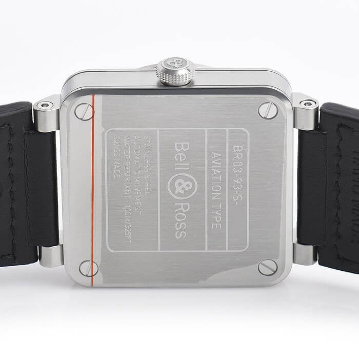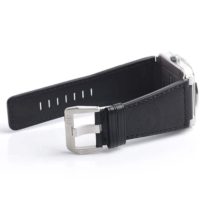 斬新な角形ケースが印象的なコレクション「BR03」。航空機のコックピット・クロックから発想を得たこの時計は、視認性を重視した機能的な道具という面が一段と強調されています。