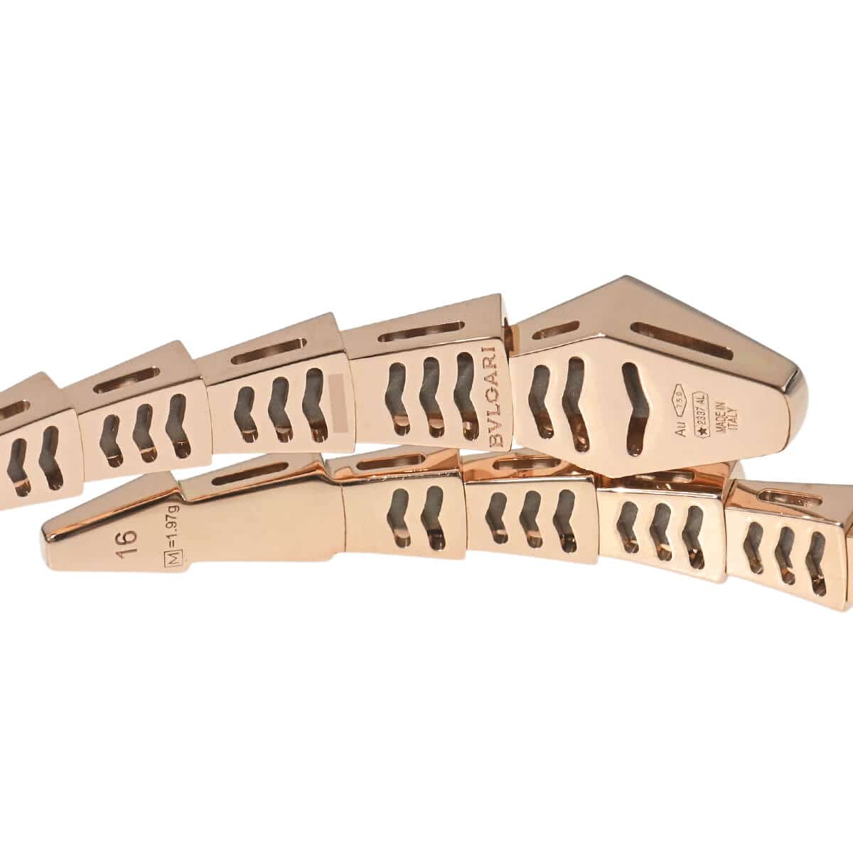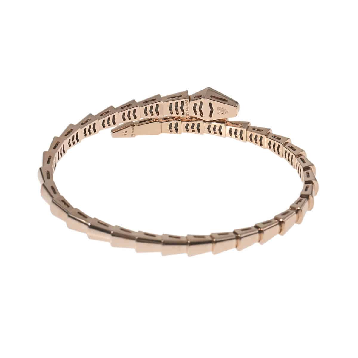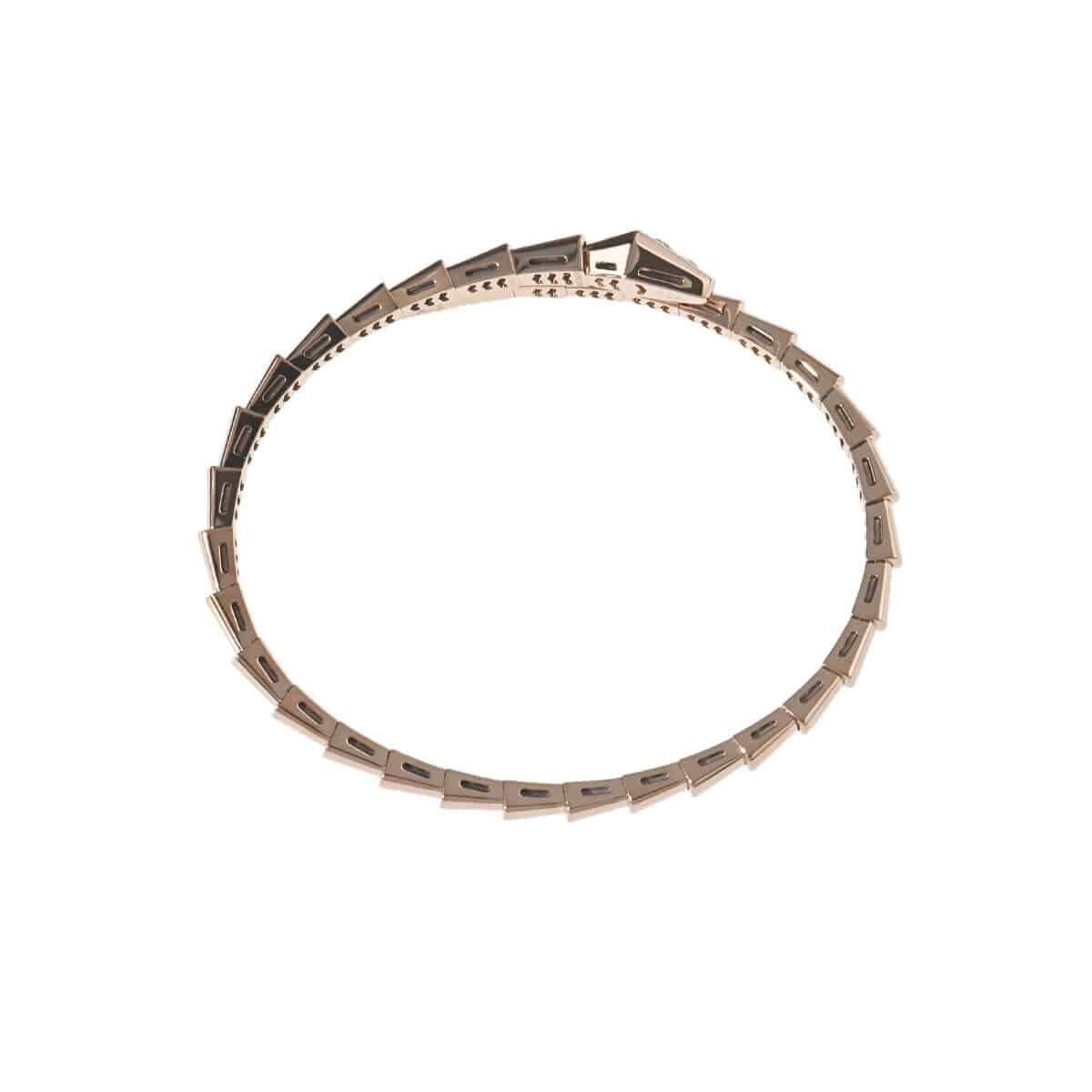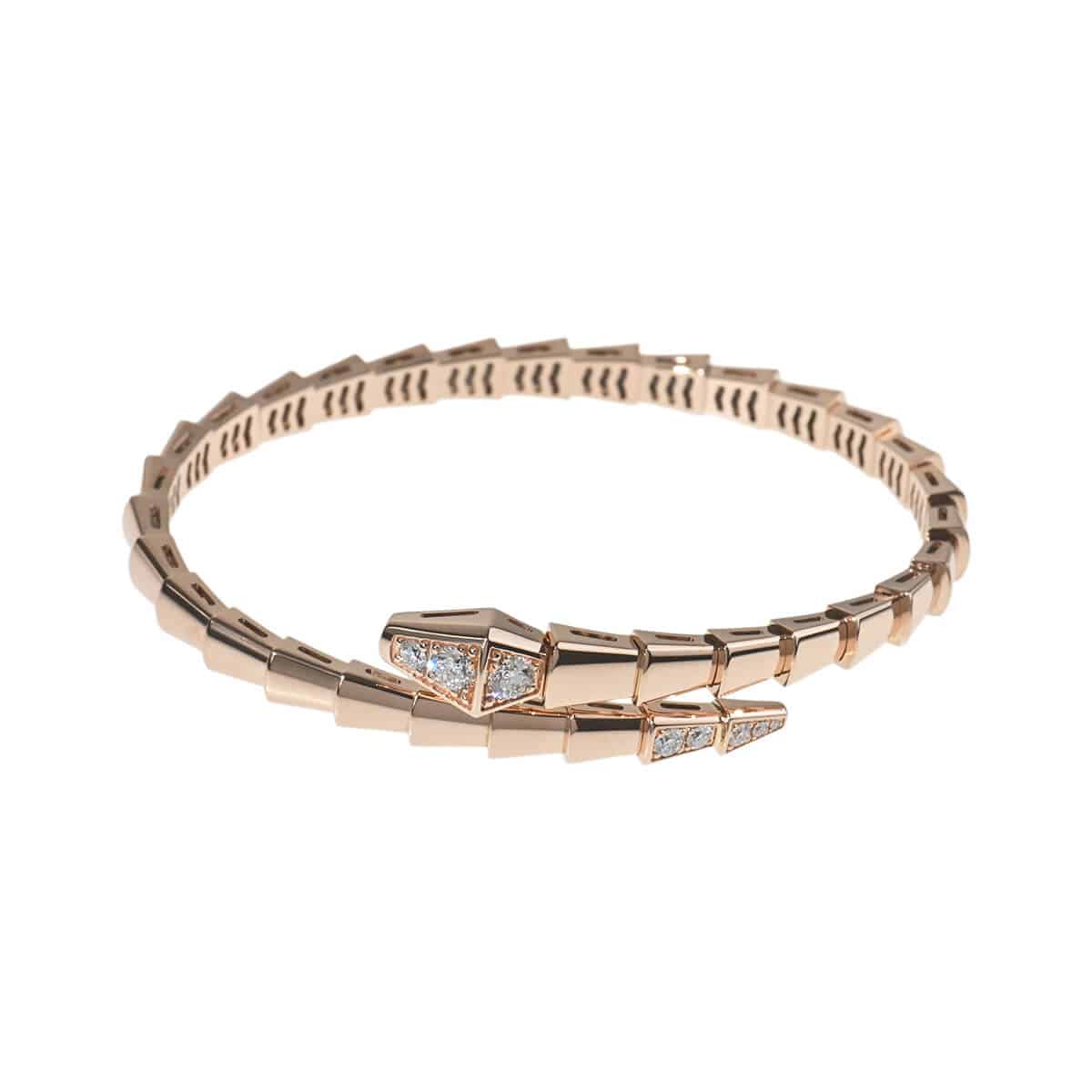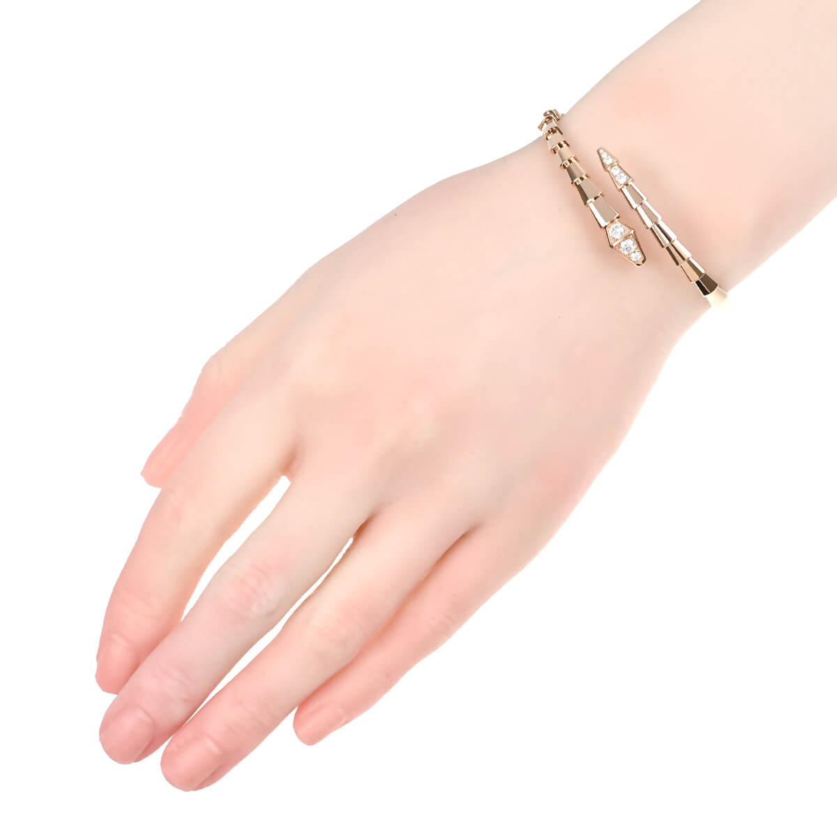 ヘビの魅惑的な力にインスピレーションを得た『BVLGARI(ブルガリ)』「SERPENTI(セルペンティ)」は、イタリアが誇る至高のクラフツマンシップと禁じられたものに手を伸ばすメゾンの大胆な姿勢が融合した、大胆でありながら洗練されて上品、官能的で魅惑的なコレクション。美しさと洗練さを兼ね備え、精巧な技術とイタリアらしいデザインが融合された、ピンクゴールド製「SERPENTI(セルペンティ)」ブレスレットです。うろこの危険な美しさとヘビのくねりが溶け合ったバングルの両端にはきらめくダイヤモンドがあしらわれ、官能と誘惑を仕掛ける妖艶なデザインがセンシュアルに手首に巻き付き、包み込むような曲線で魅了します。攻撃を仕掛ける前のヴァイパーのスパイラルな動きを思わせるデザインが、ひときわ目を引く存在感を放つブレスレットです。