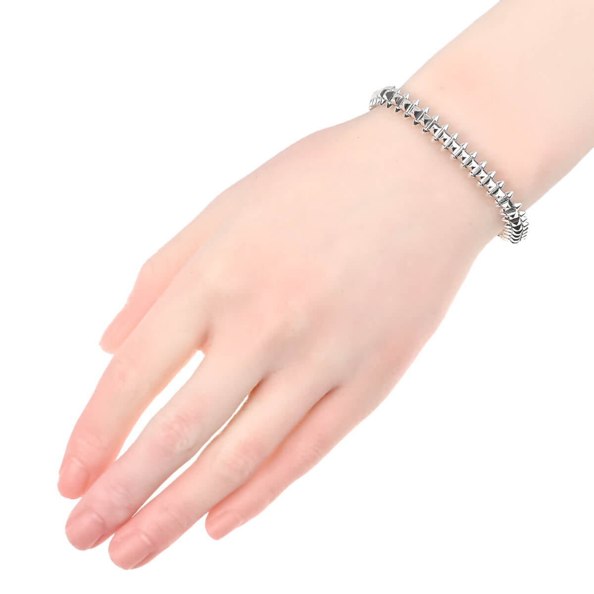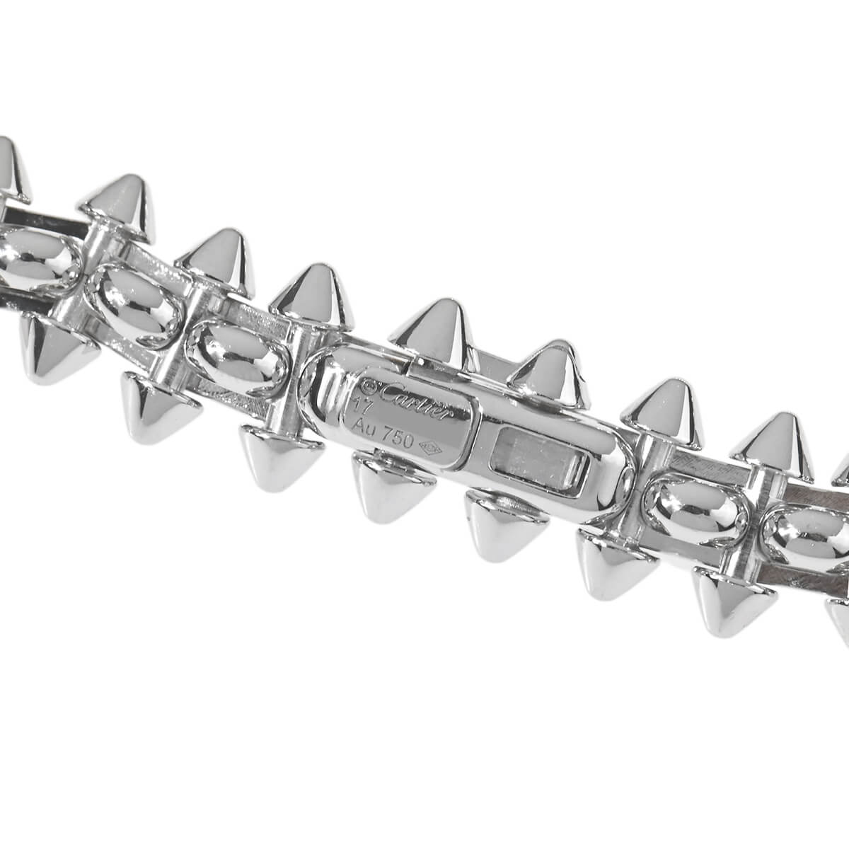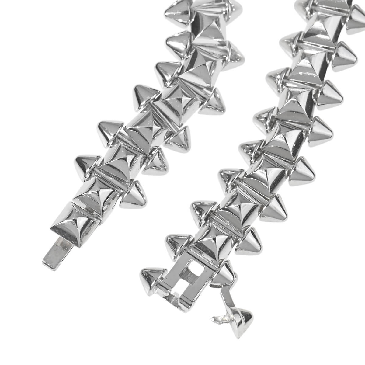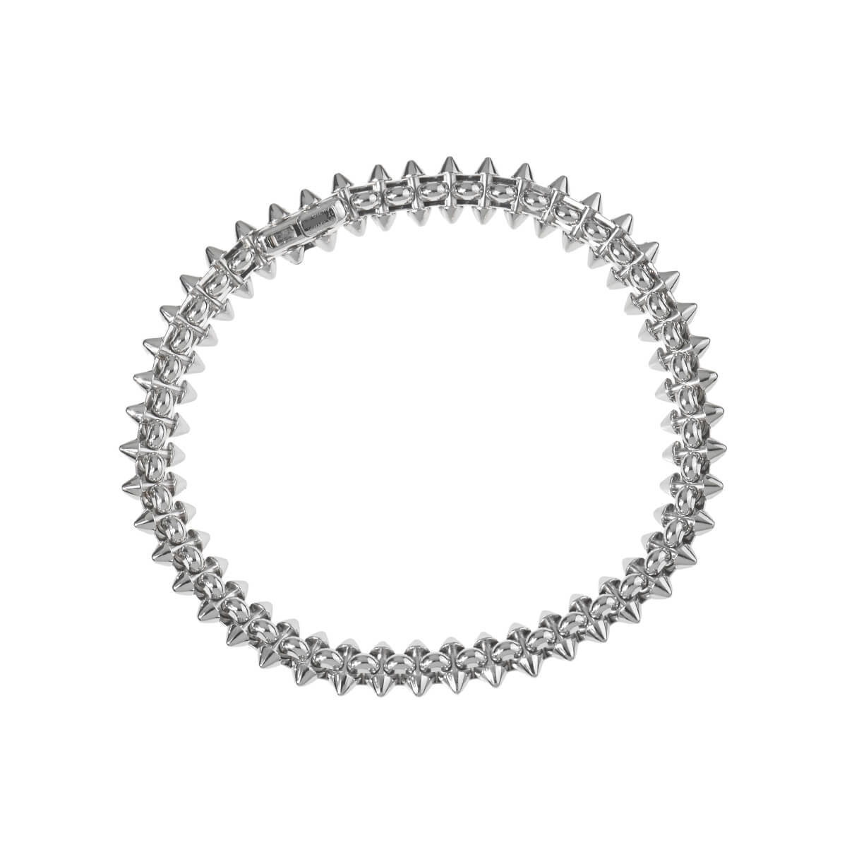 クラシックなフォルムとそこからの解放、削ぎ落されたラインと有り余るエネルギー、真面目さとちょっと羽目を外す感覚、そんな相反するものを同時に主張する「クラッシュ ドゥ カルティエ」コレクション。ジオメトリック、スタッズ、クル カレ、そしてクリエイティブな遊び心、そんな『Cartier(カルティエ)』の象徴的で伝統的なデザインコードをモダンに解釈し独創的に組み合わせた、斬新でシックなこのコレクションは未来に引き継がれるアイコンです。フランス語で“スクエア(正方形)”を意味する「カレ」から生まれたカルティエの象徴的なコードのひとつ「クル カレ」がライン中央に並び、その両サイドにあしらわれた「ピコ」と呼ばれる円錐状のスタッズと幾何学的なデザインコントラストを描く、ホワイトゴールド製MMサイズのフレキシブルブレスレット。ジオメトリックでありながらどこかフェミニン、ミニマルなデザインでありながら複雑な構造を持つ、相反するふたつの魅力を同時に主張するそのフォルムが美しく、カルティエらしい洗練を纏ったブレスレットです。
