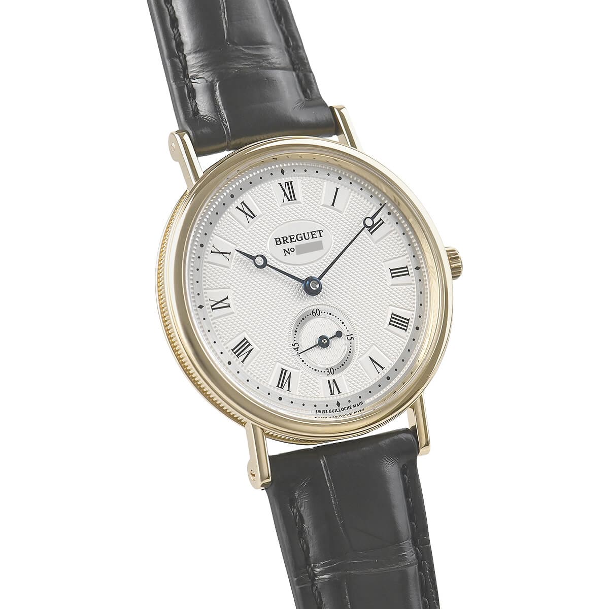 ギョーシェの刻まれたダイヤル、ブルースチールのブレゲ針、コインエッジ入りのケースなど、様々なブレゲらしい特徴を持ちながら全てが融けあう絶妙のデザイン。