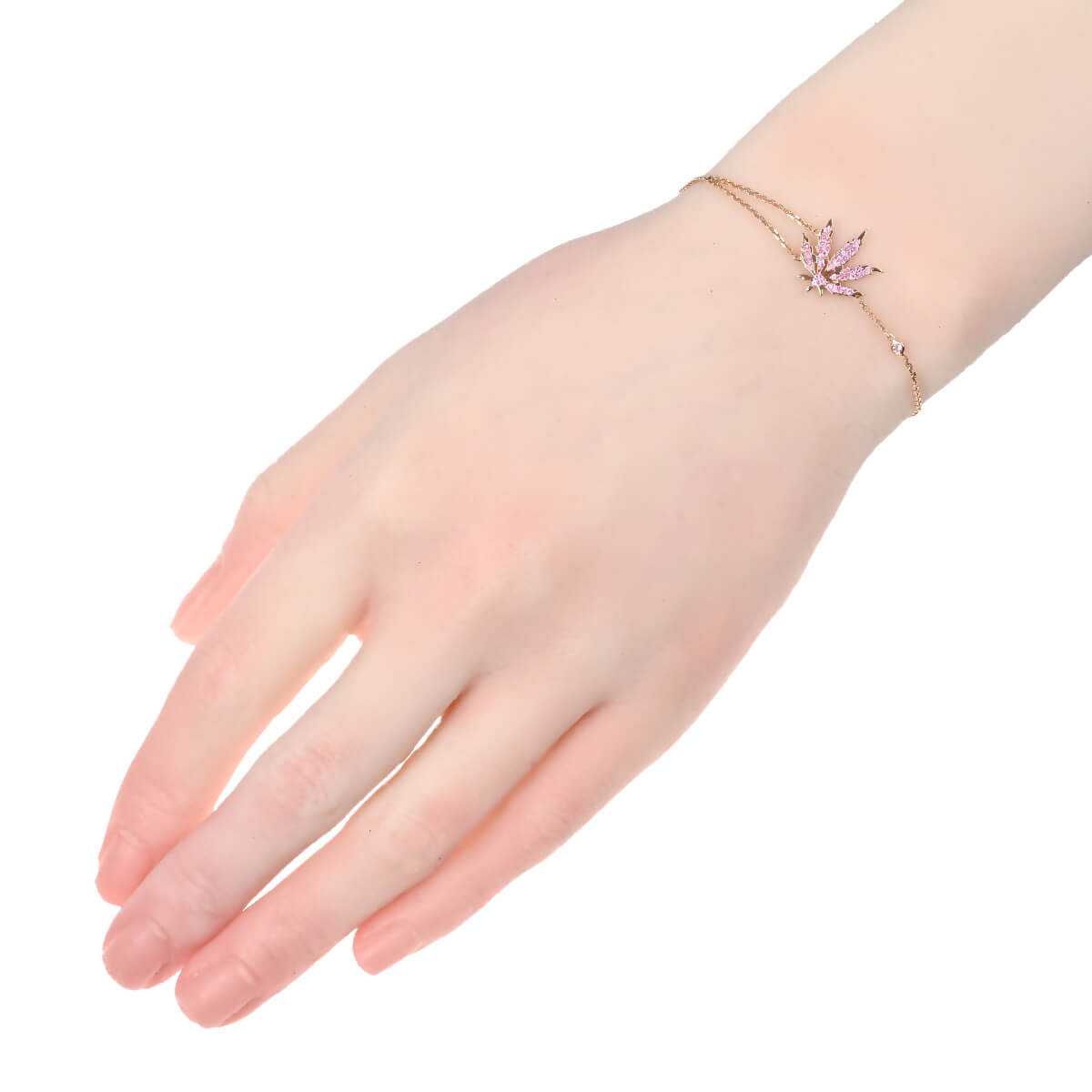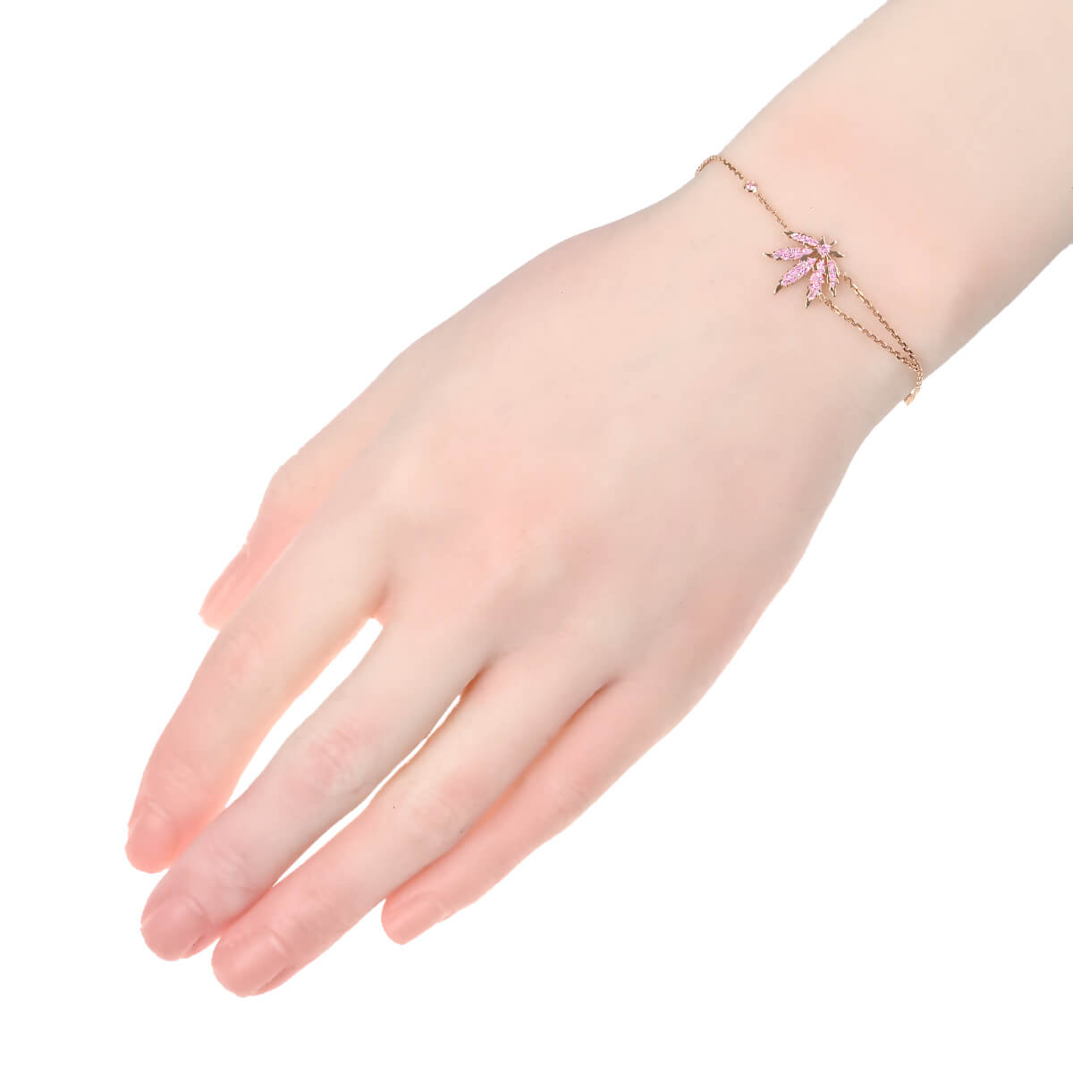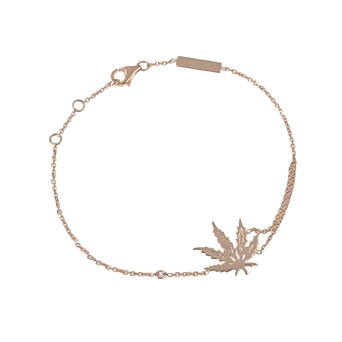 1994年にフランス・パリで誕生した“キング・オブ・カシミア”、“カシミアの王様”として世界を魅了するラグジュアリーブランド『lucien pellat-finet(ルシアン ペラフィネ)』。既存のラグジュアリーの枠にとらわれないクリーンでモダンなストリートのエッセンス、その至高のクオリティと遊び心が受け継がれたジュエリーコレクションは、既存のハイジュエリーとは一線を画す圧倒的な存在感を放ちます。ブランドアイコンのひとつである“リーフ(ヘンプ)”のモチーフに、瑞々しく輝くピンクサファイアをあしらったピンクゴールド製ブレスレット。シャープなラインで描かれたピンクサファイアのきらめきを纏ったリーフが、手首にモダンでエネルギッシュなアクセントを添えてくれます。“最高級の素材を使って、あえてストリートテイストで遊ぶ”という世界観を見事に凝縮し、ペラフィネらしい自由な感性が融合した、ラグジュアリー・ストリートの頂点を極める唯一無二のお洒落なジュエリーです。