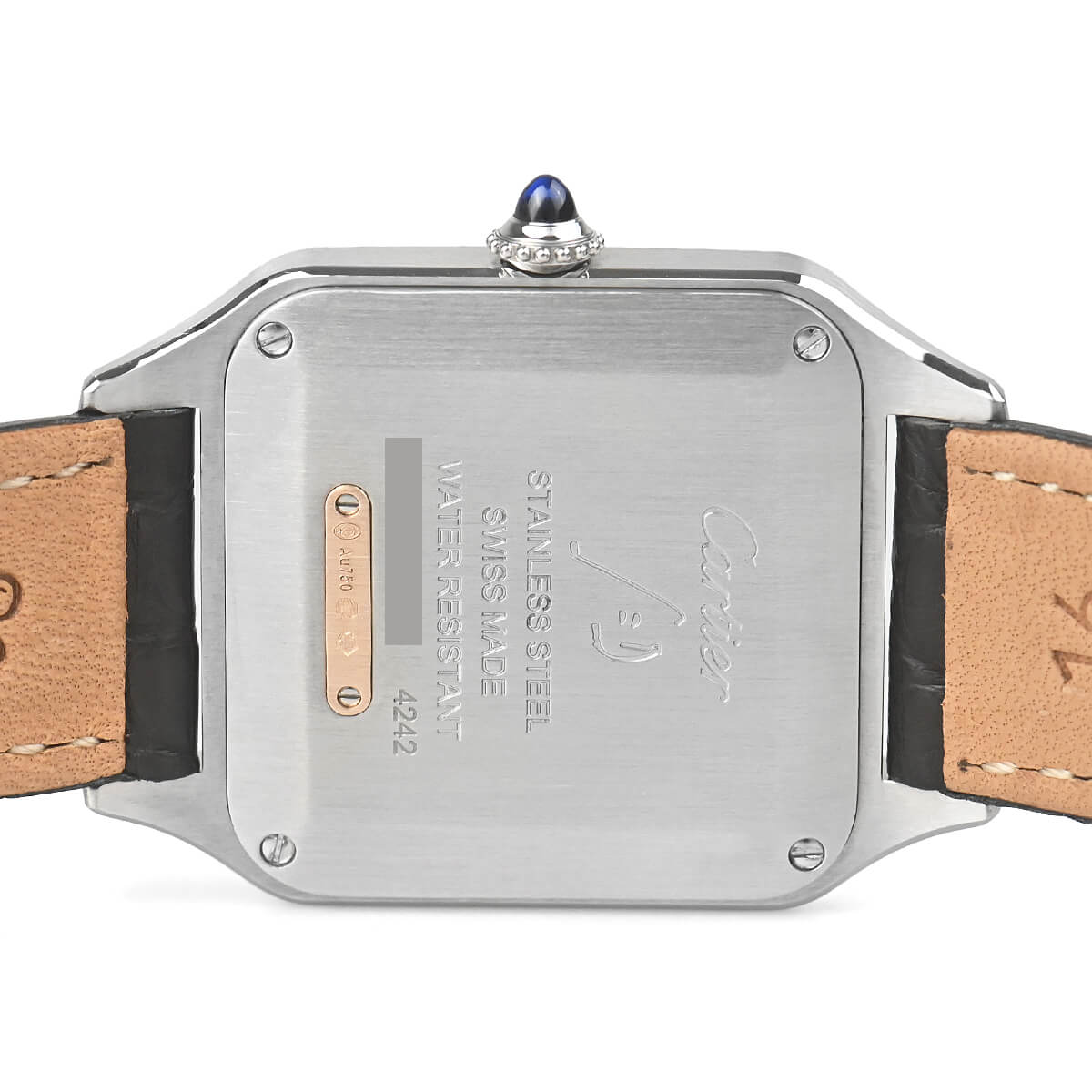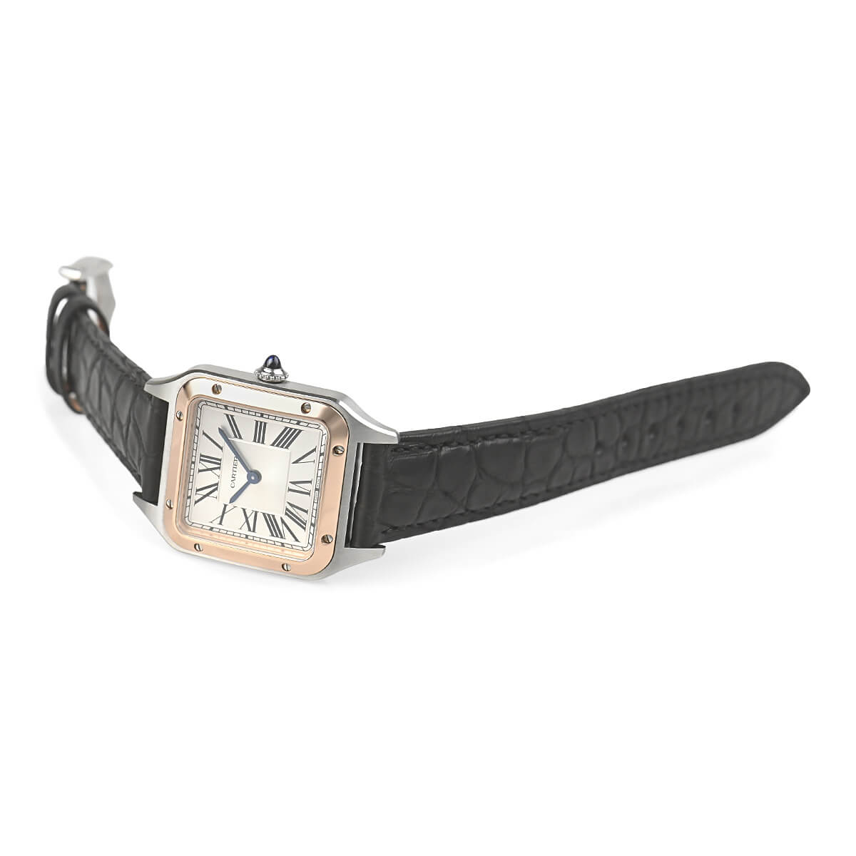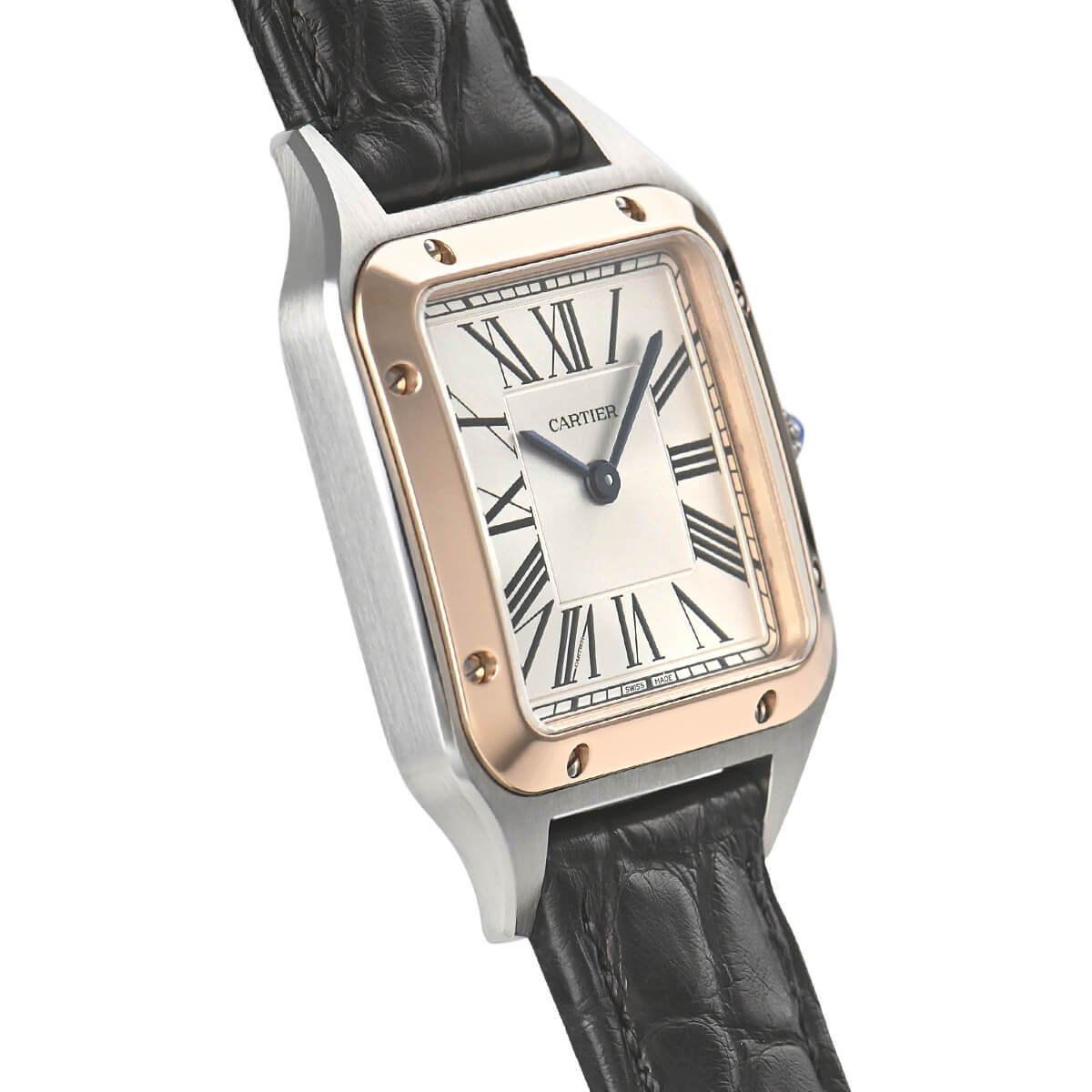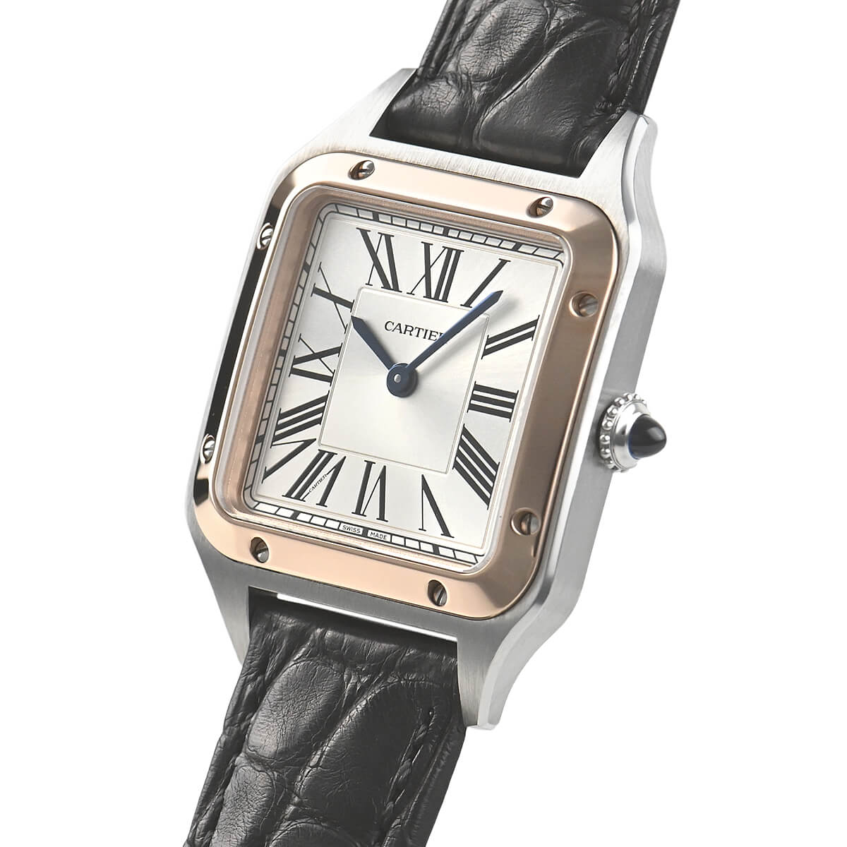 文字盤のローマインデックスとその外周に描かれた四角のレイルウェイ分目盛はカルティエウォッチを特徴づけ、またピンクゴールドのベゼル部分にはサントスウォッチ特有のビスモチーフが施されます。