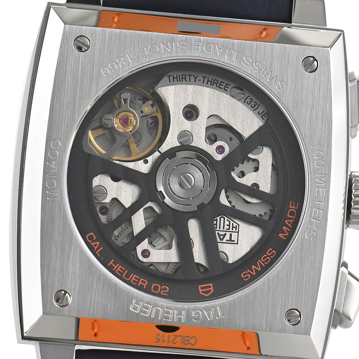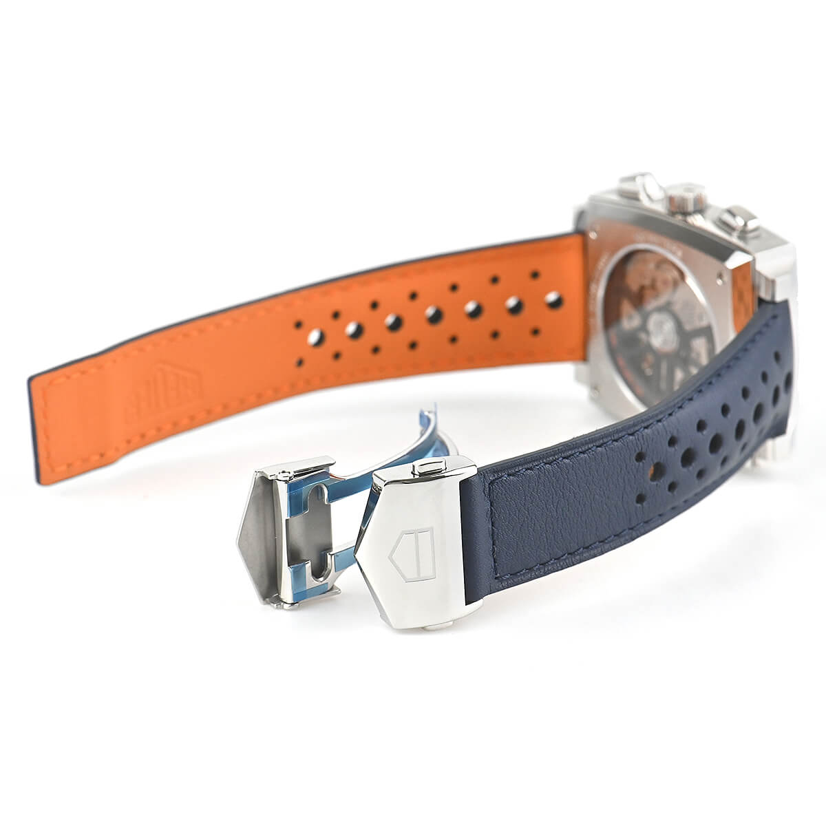 こちらは縦39mm×横39mmのスクエアケースにコラムホイール式、80時間パワーリザーブの自社製自動巻きキャリバー「ホイヤー02」を搭載したブルーダイアルバージョン。